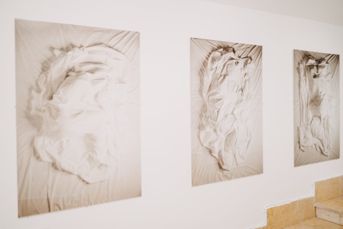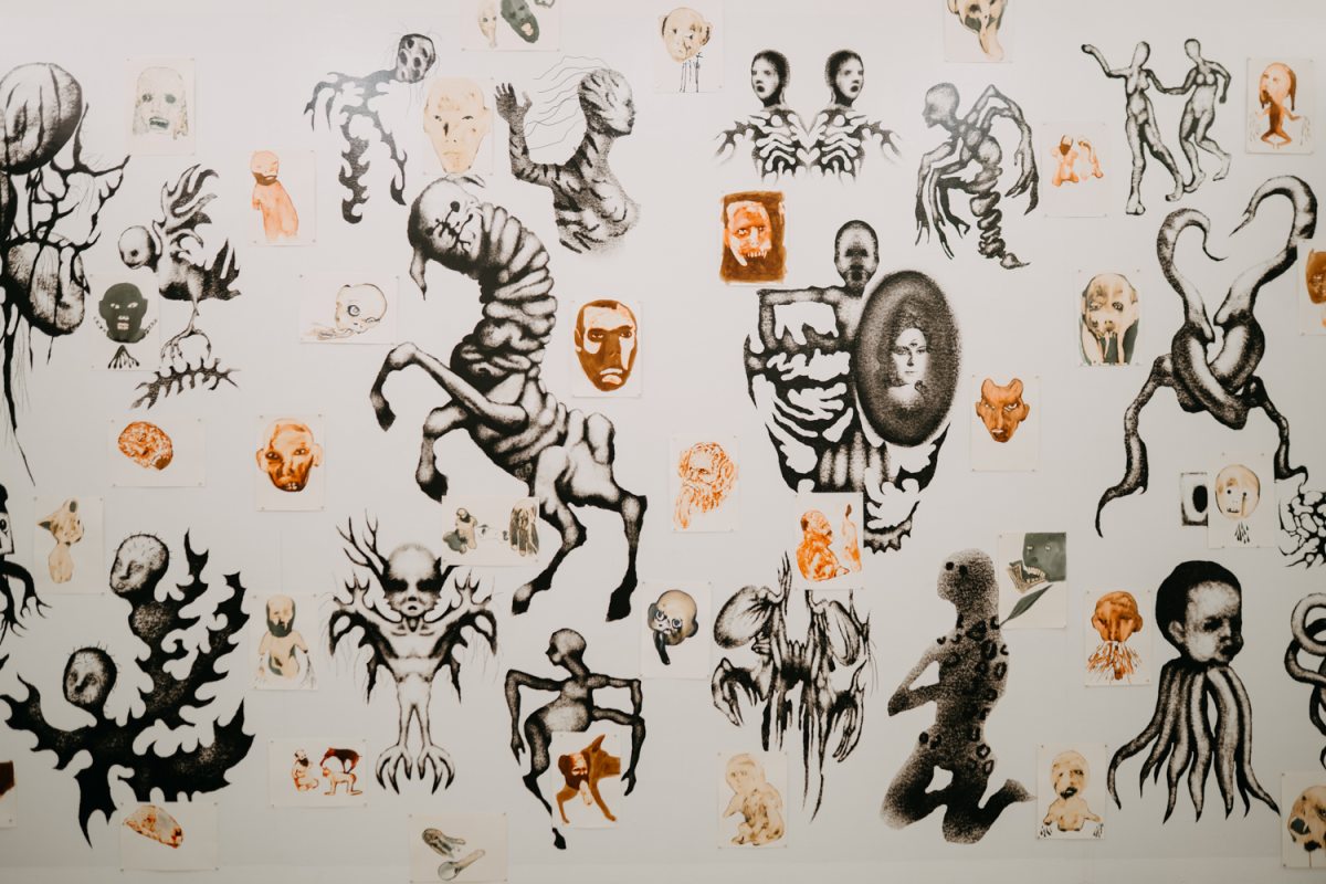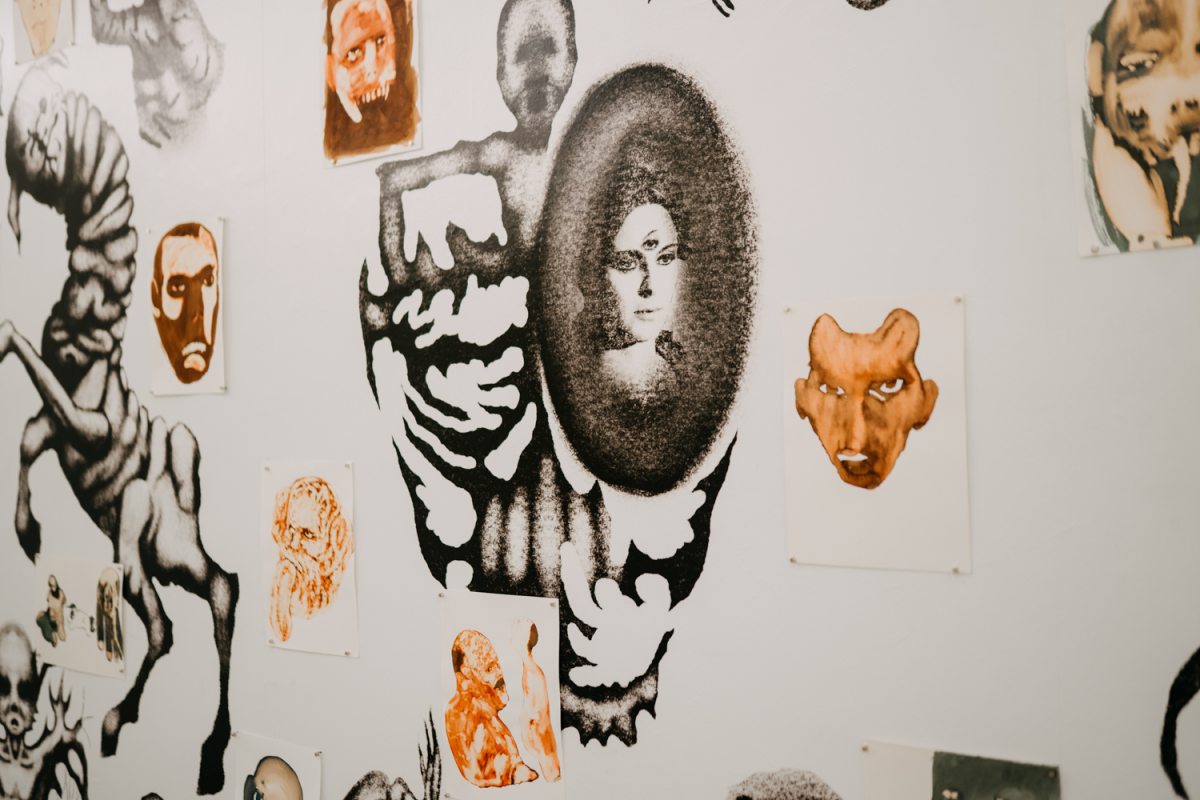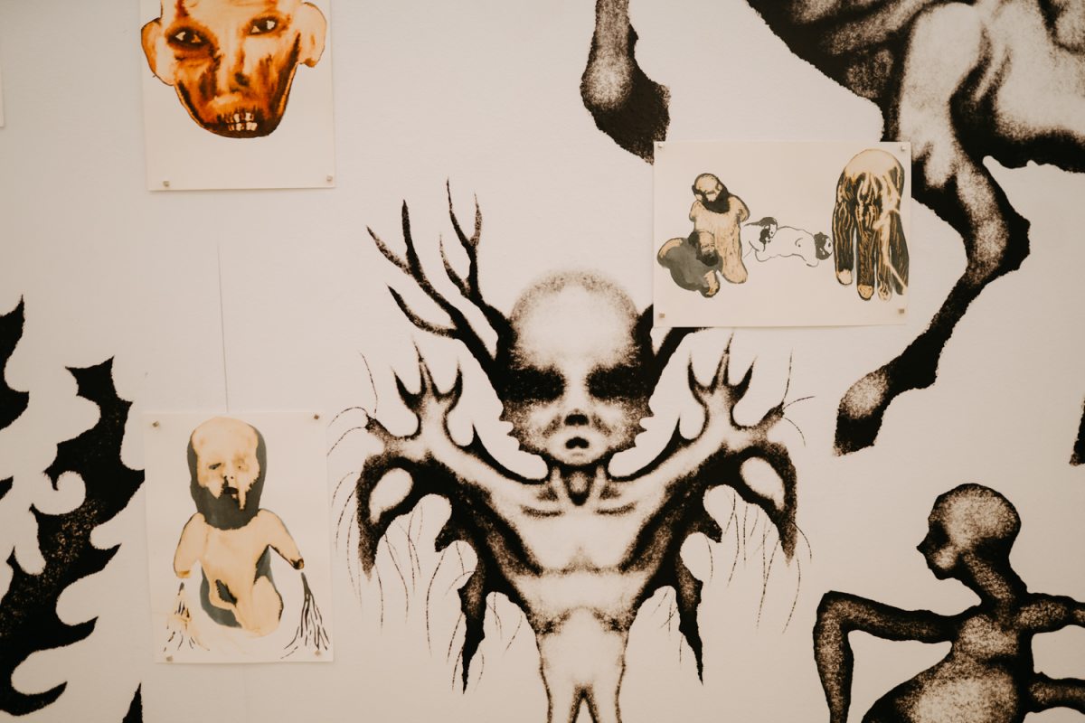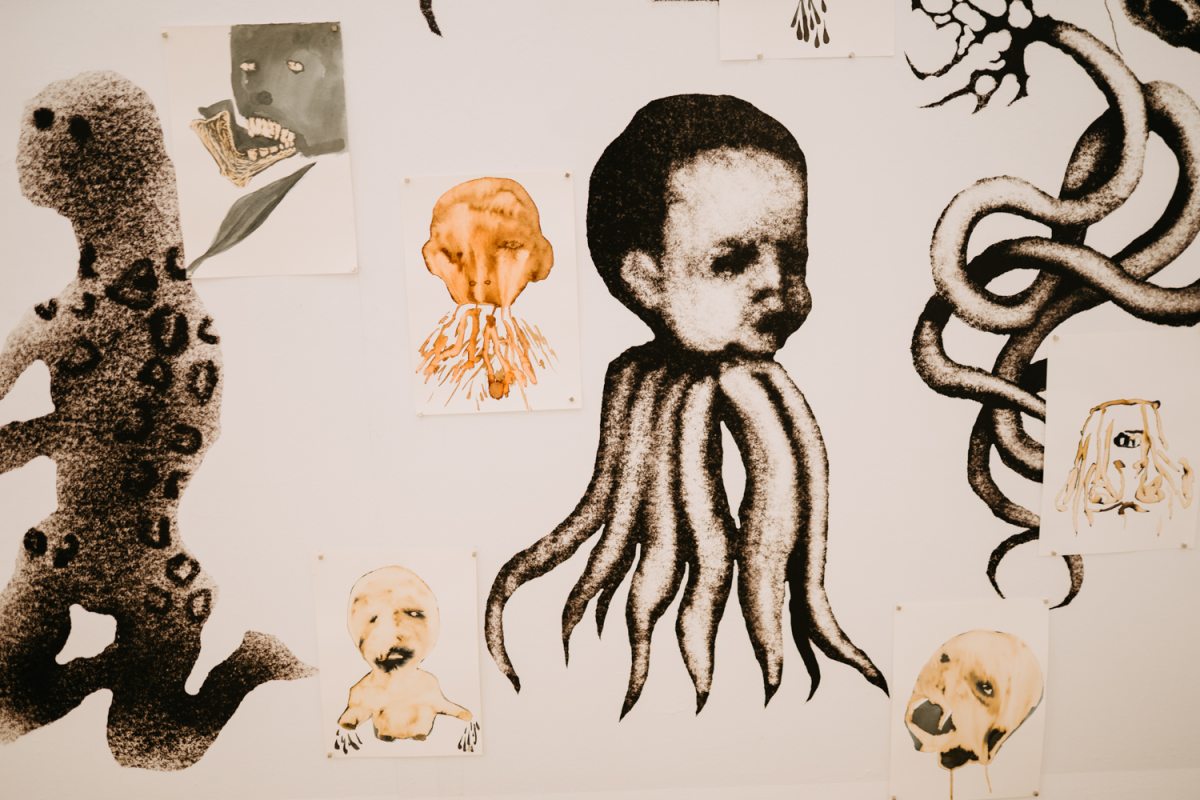 Izgalmas installáció született az alkotó korai hipórajzaiból, valamint tetkómintáiból, amelyek nagyon groteszkek, mégis líraiak, és jól kifejezik az egyén egzisztenciális szorongását, világba vetettségét, valamint rámutatnak, hogy a kívülről érkező hatások miként torzítják el a testet. Az élet hatalmas szívás, folyamatosan küzdünk az elemekkel, próbálunk túlélni és fennmaradni, közben folytonosan megszégyenülünk, kiszolgáltatottá válunk, vagy éppen darabjainkra hullunk. Ezt állítja mindkét sorozat, amelyet most azért is izgalmas egymás mellett látni, mert míg a hipóval készült rajzok az alkotó egyetemistaévei alatt születtek, addig a tetkóminták új korszakot jelölnek az életműben. Bár időben távol vannak egymástól, gondolatiságuk összefűzi őket.