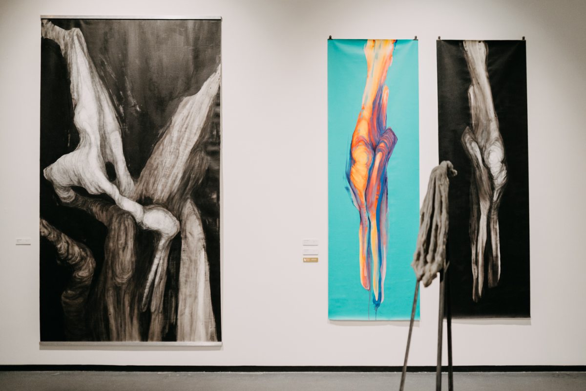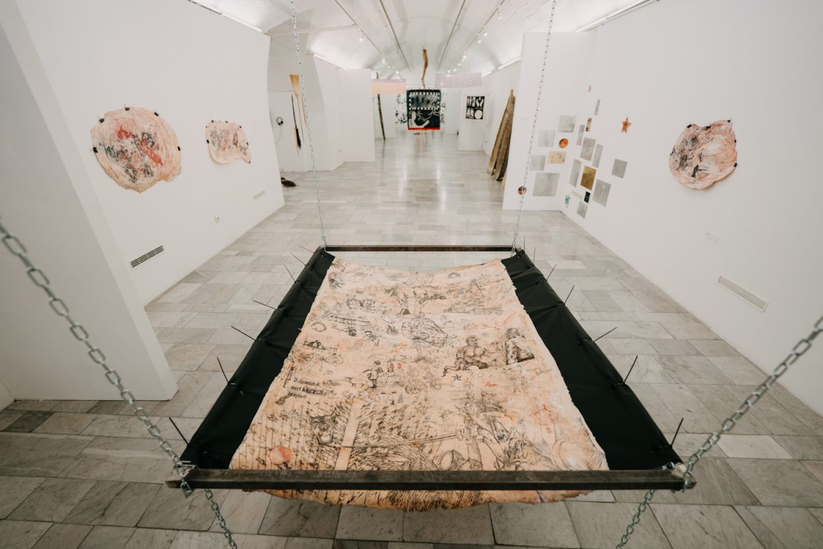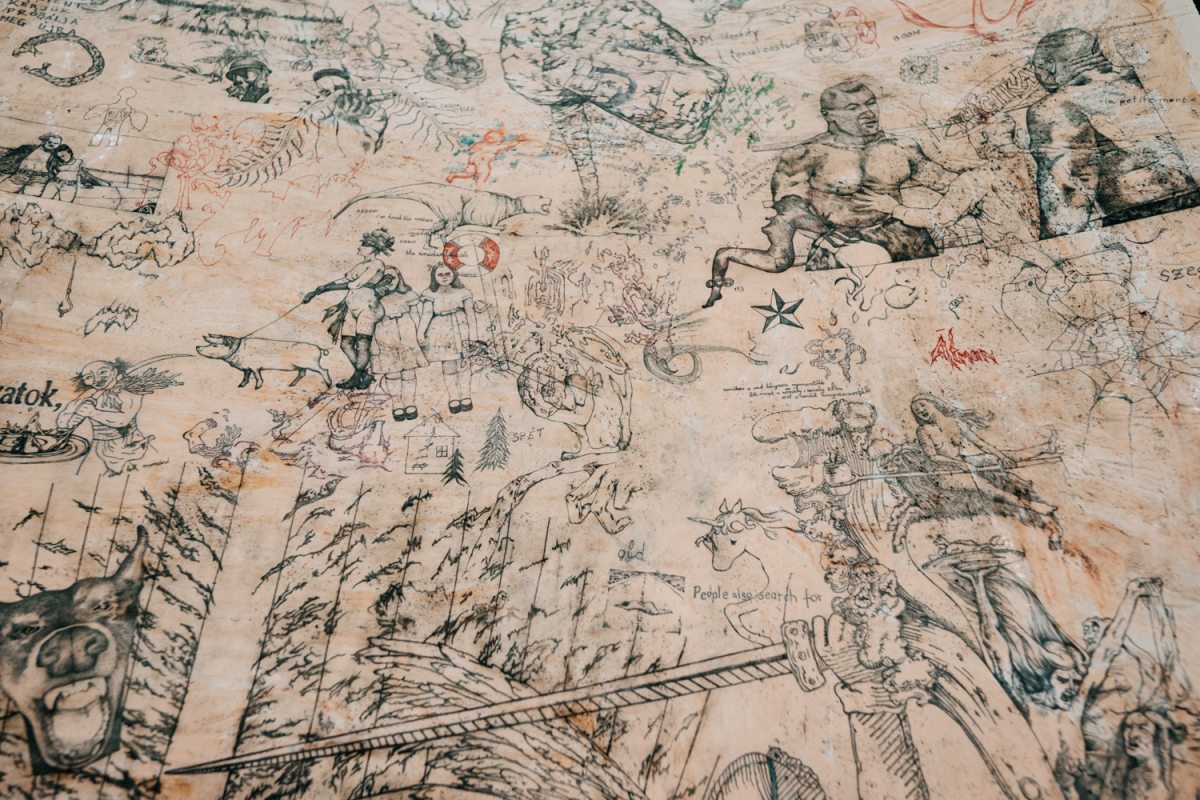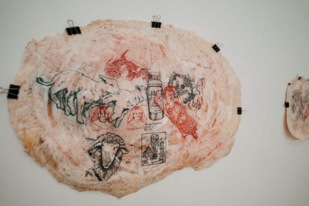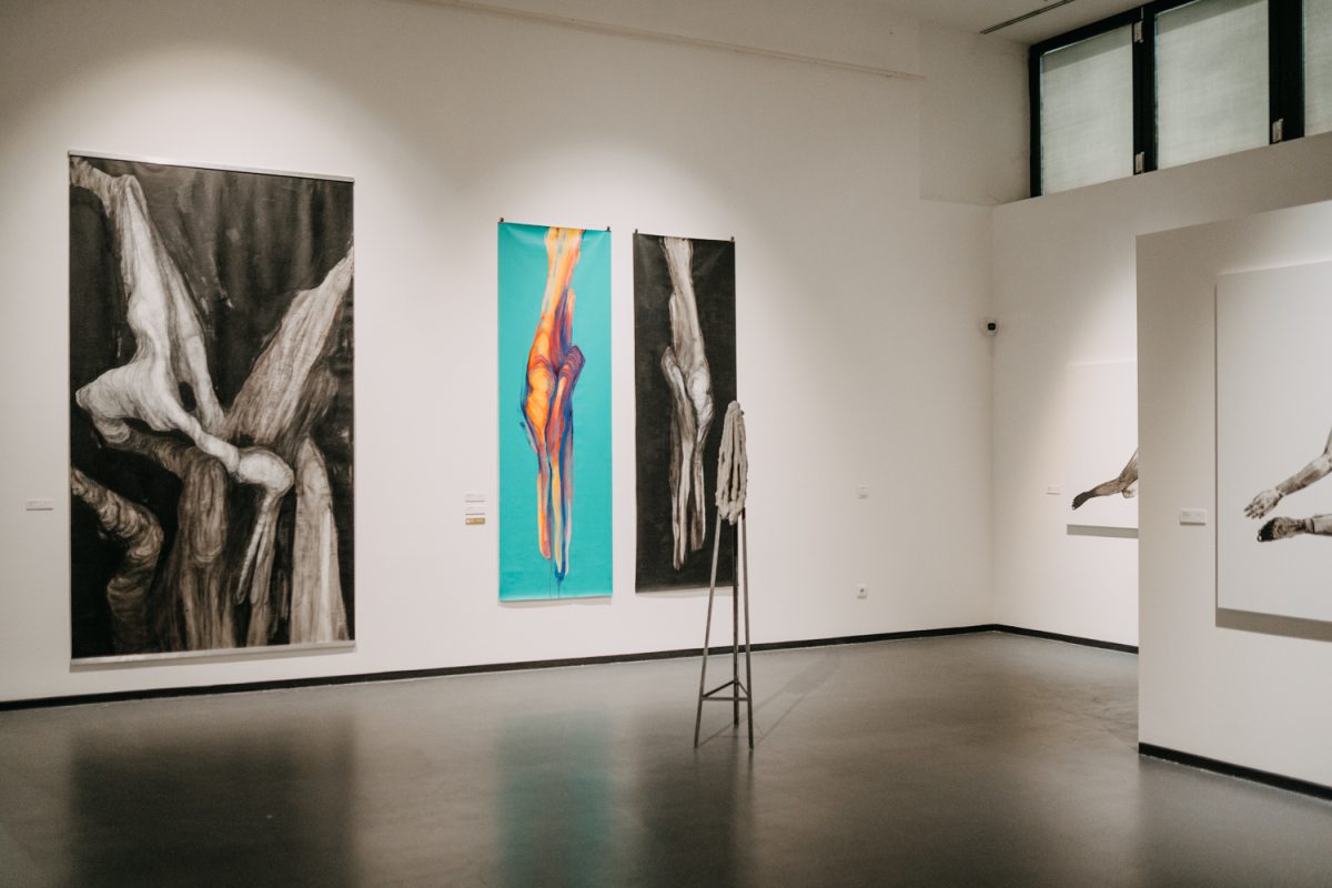 Izgalmas installáció született az alkotó korai hipórajzaiból, valamint tetkómintáiból, amelyek nagyon groteszkek, mégis líraiak, és jól kifejezik az egyén egzisztenciális szorongását, világba vetettségét, valamint rámutatnak, hogy a kívülről érkező hatások miként torzítják el a testet. Az élet hatalmas szívás, folyamatosan küzdünk az elemekkel, próbálunk túlélni és fennmaradni, közben folytonosan megszégyenülünk, kiszolgáltatottá válunk, vagy éppen darabjainkra hullunk. Ezt állítja mindkét sorozat, amelyet most azért is izgalmas egymás mellett látni, mert míg a hipóval készült rajzok az alkotó egyetemistaévei alatt születtek, addig a tetkóminták új korszakot jelölnek az életműben. Bár időben távol vannak egymástól, gondolatiságuk összefűzi őket.