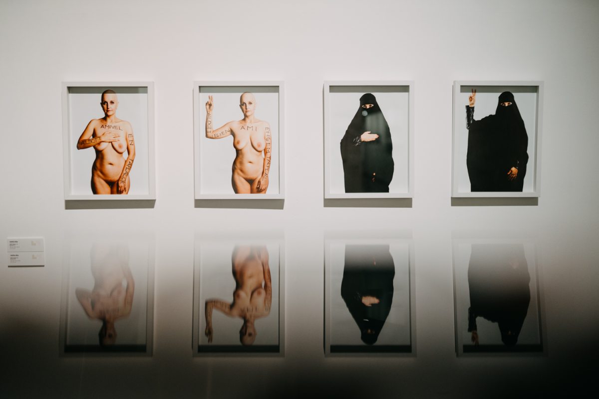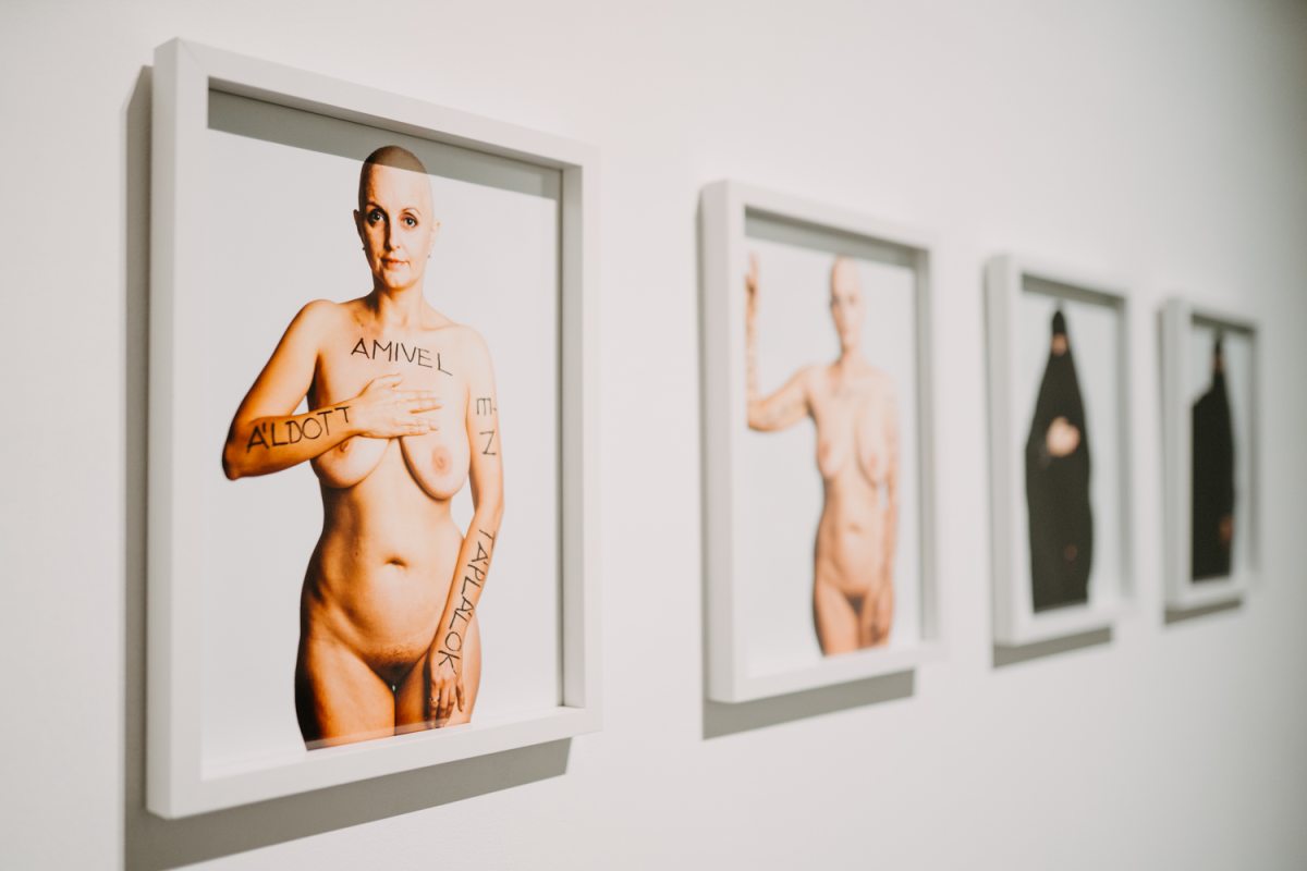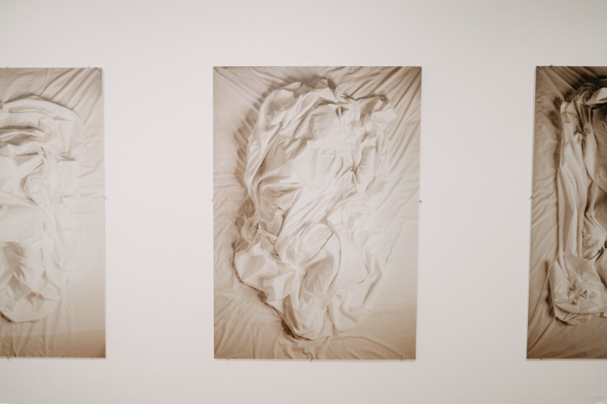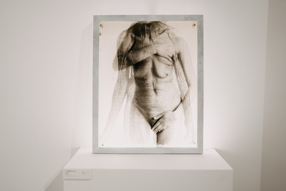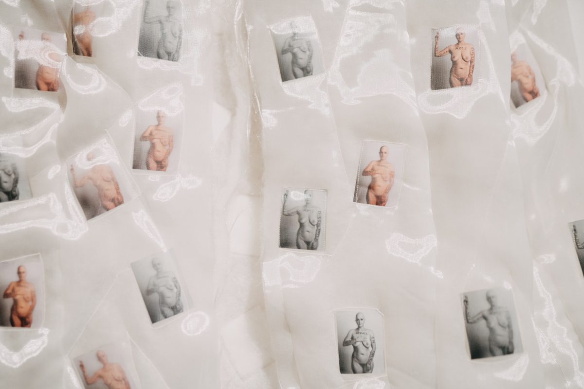 A kimondhatatlansággal és a láthatatlansággal foglalkozik a művész sűrűn rétegzett, komplex alkotása, amelyen az eltakart test és a hozzáférhetetlen szöveg a szenvedés és az elrejtettség párhuzamait is megvilágítja. Az egyik oldalon plexikarc mögött jelennek meg a betakart, elrejtett testek, a másikon pedig kendő fedi sejtelmesen a testábrázolásokat, amelyeken fordítva szerepelnek a szövegek. A bibliai utalásokkal gazdagon átszőtt, vallomásos textusok egyéni, mégis univerzális örömöket és fájdalmakat közvetítenek, amelyek zsigerileg, testileg hatnak.