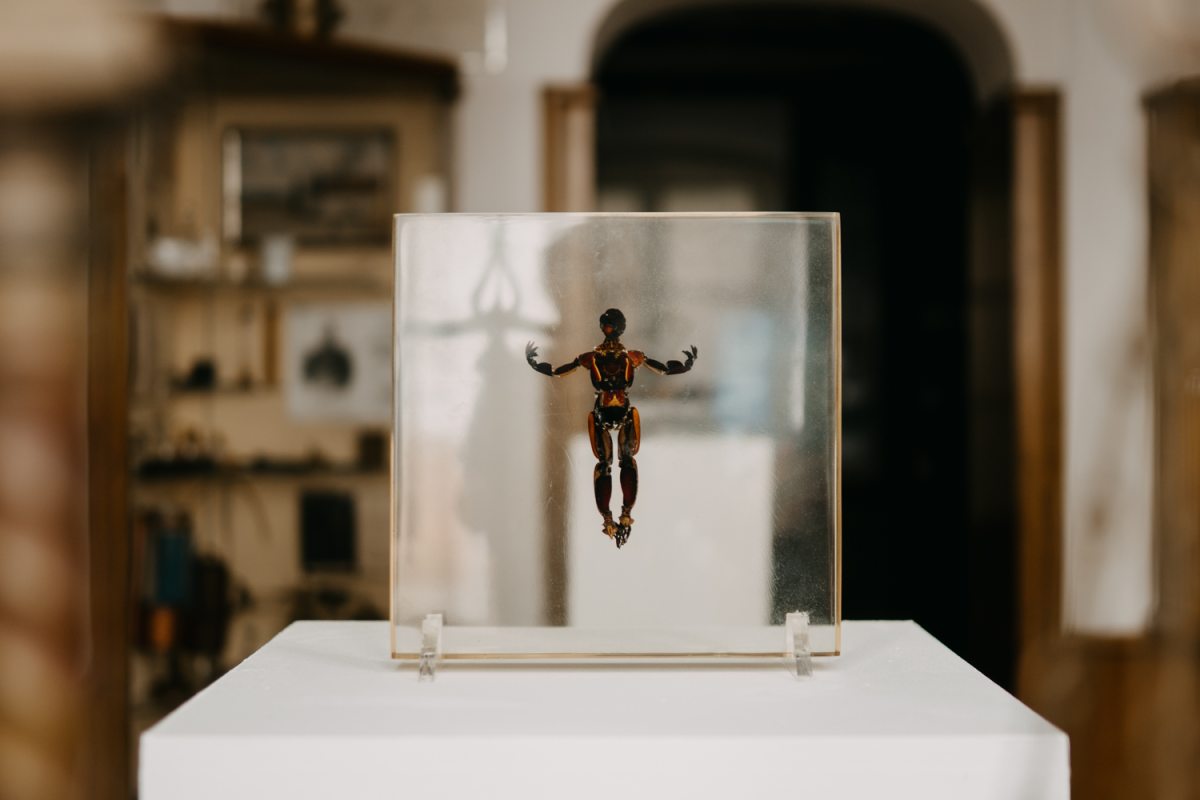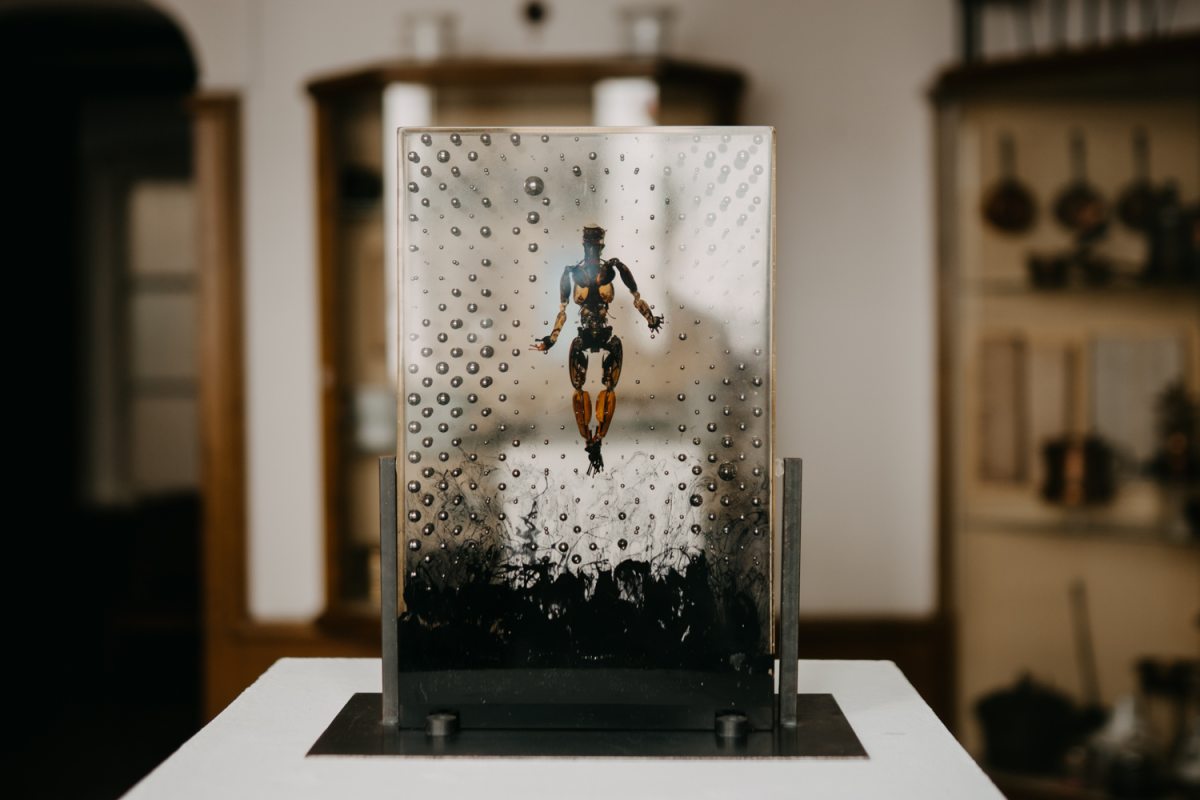 A pécsi Szerecsen Patikamúzeumban látható anyag kihívó és meghökkentő: Szöllősi kitinpáncélból hozta létre emberalakjait, amelyek egyszerre idézik meg az anatómiai ábrázolásokat, valamint a kiborgok világát. Poétikus provokáció és magánmitológia, a tudomány és a művészet, a múlt és a jövő, a banalitás és a transzcendencia között billegve.