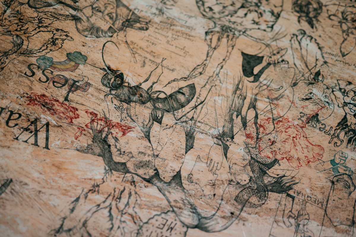 E műben olyan rajzok véletlenszerűen elrendezett sorozatát látjuk, amelyeket az alkotó sertésbőrre emlékeztető szilikonalapra tetovált fel. Az alkotó Michel Foucault A szexualitás története című művének olvasása közben, asszociatív módon, minden racionalitást hátrahagyva rajzolta fel e jeleneteket, így a groteszk arcábrázolásoktól a keresztény szimbólumokon át a boszorkányperek motívumain át sokféle látvánnyal találkozhatunk, amelyek végül sűrű szövetet alkotnak, a test feletti erőszakos uralomról tanúskodva. A mű az abject fogalmát is játékba hozza: a felület egyszerre vonzó és undorkeltő, bőrre emlékeztető anyag, a függő installációs elrendezés pedig még inkább kiemeli a női test birtoklásának és tárgyiasításának kérdését.