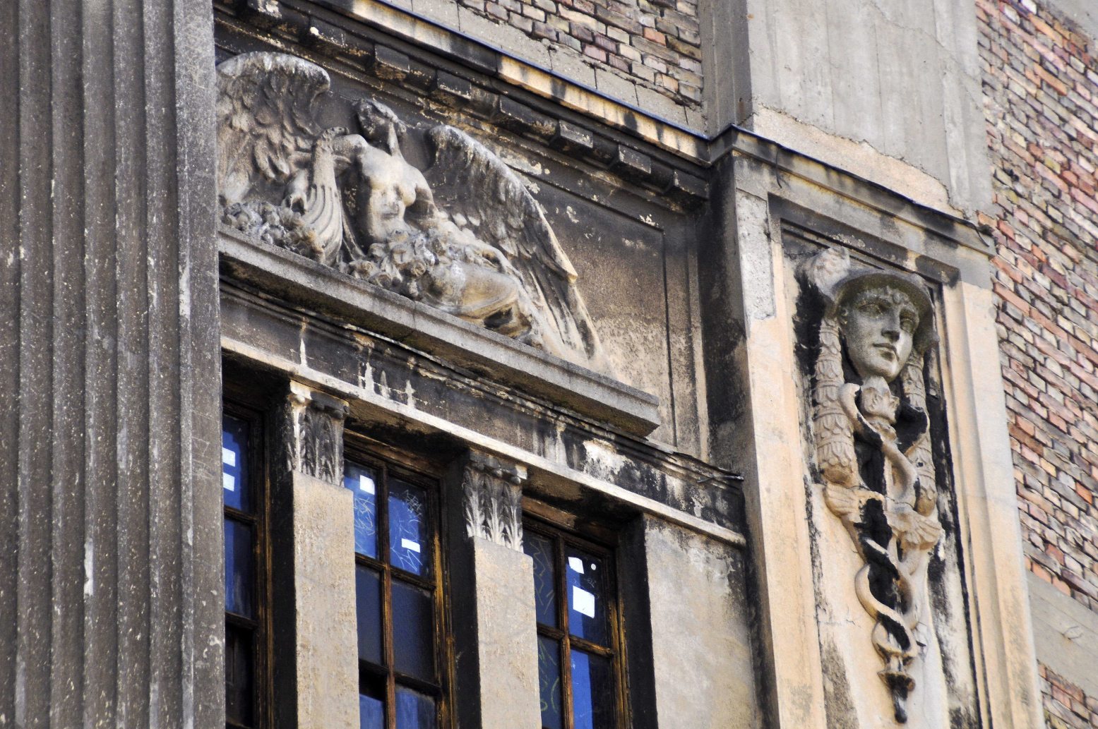 A kilenc tengelyes főhomlokzat földszinti kirakatai felett az első emeleten félköríves portálok és baluszteres (oszlopformájú támaszték) erkélyek helyezkedtek el, a másik három szintet jón falpillérek tagolták, kétemeletnyi ablakmezőkkel. A homlokzatot lezáró főpárkány fölött ismét baluszteres korlát, a sarkokon kőbábok, a főbejárat fölött négy nőalak állt. A középrizalitot (az épület teljes szélességében végig futó kiszögellés) páros pilaszterek (féloszlopok) hangsúlyozták. A központi csarnokot és a főlépcsőt is Beck Ö. Fülöp és Pongrácz Szigfrid szobrai, plasztikái díszítették.