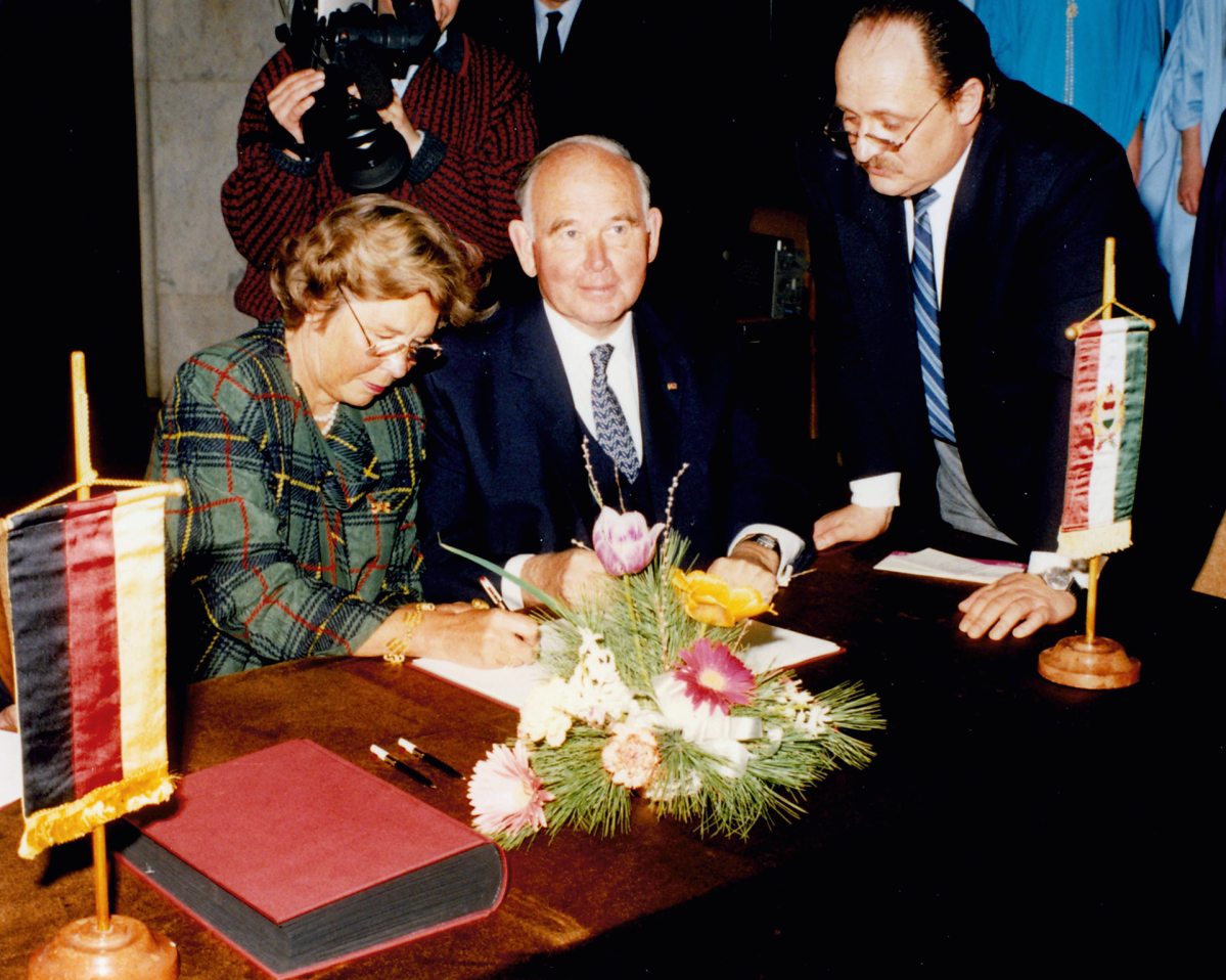 Amikor 1987-ben Peter Ludwig ismét Budapestre érkezett, a minisztérium Bereczky Lorándot, a Magyar Nemzeti Galéria igazgatóját bízta meg a tárgyalásokkal, aki a kezdeményezést összekapcsolta az 1945 utáni magyar művészet bemutatásával. A felek megállapodtak egy nemzetközi kiállítás megrendezésében, valamint egy Picasso grafikai anyag bemutatásában. A Ludwig-gyűjteményből rendezett nemzetközi kiállítás 1987. október 16-án nyílt meg a Magyar Nemzeti Galériában, melynek alkalmából Irene Ludwigot az ELTE díszdoktorává avatták. 1988 márciusában nyílt meg a Picasso grafikai kiállítás a Budavári Palota A épületében. A megnyitót követően került sor a magyarországi Ludwig Alapítvány létrehozásáról szóló szerződés ünnepélyes aláírására. Peter Ludwigot díszdoktorrá avatták a Magyar Képzőművészeti Főiskolán, aki ez alkalomból ösztöndíjat alapított a hallgatók számára, amely ma is elérhető.