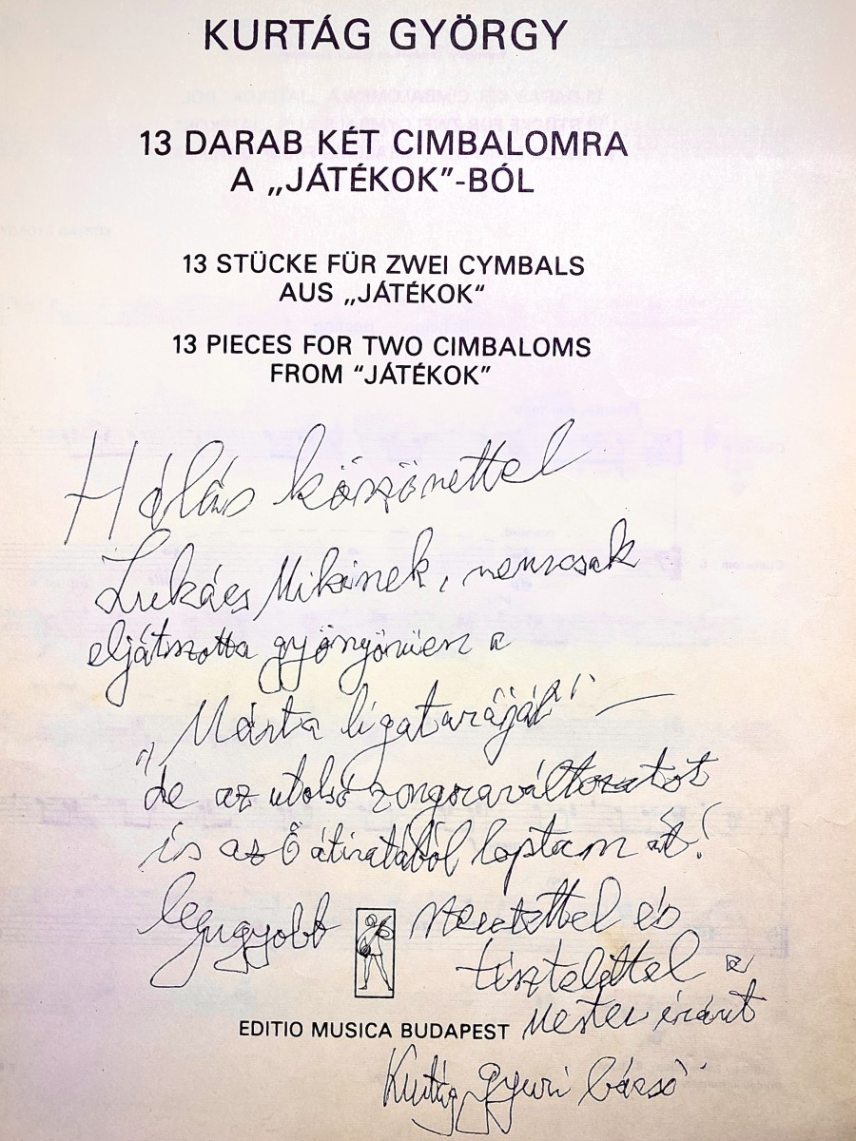 Gondolom, hogy Gyuri bácsira hatott az én cimbalmozásom. Egyébként abszolút szabad kezet adott. Azt mondta: „Figyelj, te vagy a cimbalmos, itt a darab, gondolkozz, hogyan lehetne ezt a legszebben és legjobban előadni.” Miután elvittem neki az ötleteimet, azt mondta: „ez nagyon jó irány”, aztán megint belenyúlt a darabba, és így tovább. Nagyon szép és számomra rendkívül megtisztelő volt a közös munkafolyamat. Ennek a két és fél perces darabnak olyan az aurája, a tisztasága, hogy mindenkit ámulatba ejt.