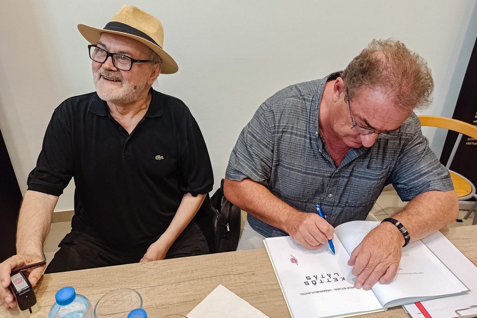 Süllyedek, mélyre, hogy nem ismertem fel, majd zavaromon túllendülve megkérdezem, ha nem zavarom, csatlakozhatom-e hozzá, ülhetek-e mellé. Igennel felel, majd elmeséli, hogy tegnap már Budapesten is bemutatták a könyvet, tudtam-e róla, nem tudtam, válaszolok. De most itt vagyok, itt vagyunk: Szolnokon, ahol az ikonikus művésztelep idén 120 éves, és ahol június közepén, hétfőn este hattól egy költő és egy képzőművész közös alkotását mutatták be. A Kettős látás című kötetről van szó, amelyet Turczi István író, költő, műfordító szövegei és Vásárhelyi Antal illusztrációi alkotnak. A művet Verebes György Munkácsy-díjas festőművész, grafikus, a Szolnoki Művésztelep vezetője és Jenei Gyula költő, tanár, az Eső folyóirat főszerkesztője mutatták be.