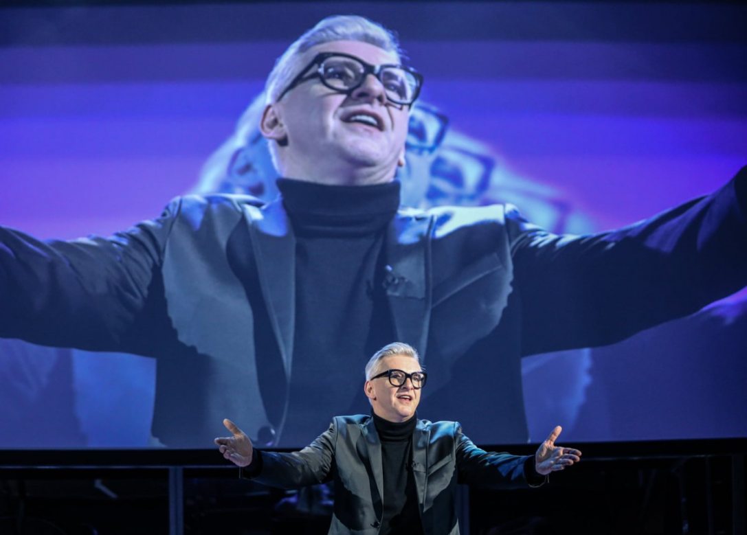 Alföldi Róbert Howard Beale szerepében ebből a szempontból már kezdettől fogva gyanús. Ezt elsőre színészi hibának véltem. A tévés nyüzsgés, a precíz háttérmunka, az adáskezdet előtti fontoskodás, a visszaszámlálás rekonstrukciója elképesztően profi a Centrál színpadán, és azonnal magába szippantja a nézőt. Paradox módon éppen a színházi helyszínről ragadja el a tévé univerzumába, képernyőjére, amely évtizedeken át a világ legfontosabb helyének tűnt. A hírgyártó gépezet mindent a legtökéletesebben előemésztett formában tesz a veterán híradós alá, a szavai azonban már kezdettől súlyosabbak, vészjóslóbbak, megengedhetetlenül emberszabásúak. Ajjaj, gondoltam magamban: Alföldi már ebben a sótlan bejelentkezésben is színész akar lenni: jelentőségteljes ott, ahol a jelentéktelenség látszatát kellene keltenie.