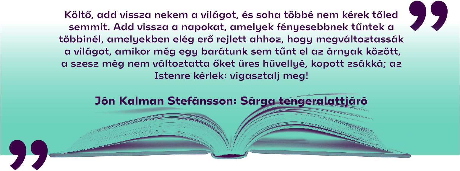 „2024-ben a Budapesti Nemzetközi Könyvfesztivál díszvendége volt Jón Kalman Stefánsson izlandi író, akinek akkor jelent meg magyar nyelven a gyűjteményes verseskötete, és az a megtiszteltetés ért, hogy személyesen interjúzhattam vele. Őt egészen addig elsősorban regényíróként ismertük, holott, saját bevallása szerint, elsősorban költő. A verseskötete is mély benyomást tett rám, de most a Sárga tengeralattjáró című regényéről szeretnék beszélni, ami egy befelé forduló, álmodozó kisfiú felnövéstörténete, olyan csodálatos gondolatok kíséretében, amik folyamatosan levettek a lábamról.
