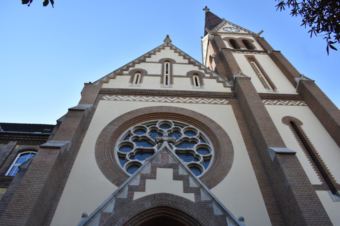 Az iskola Bajza utcai felőli végén található a templom, amelyet Pecz a párizsi Sainte-Chapelle mintájára tervezett: francia elődjéhez hasonlóan nagy belmagasságú, karcsú pilléreken álló, kereszt- és csillagboltíves, légies hatású épület. A szószéket oldalt, a karzattal szemben helyezte el, hogy a mellékhajó szélesebb, így a templom befogadóképessége nagyobb lehessen.