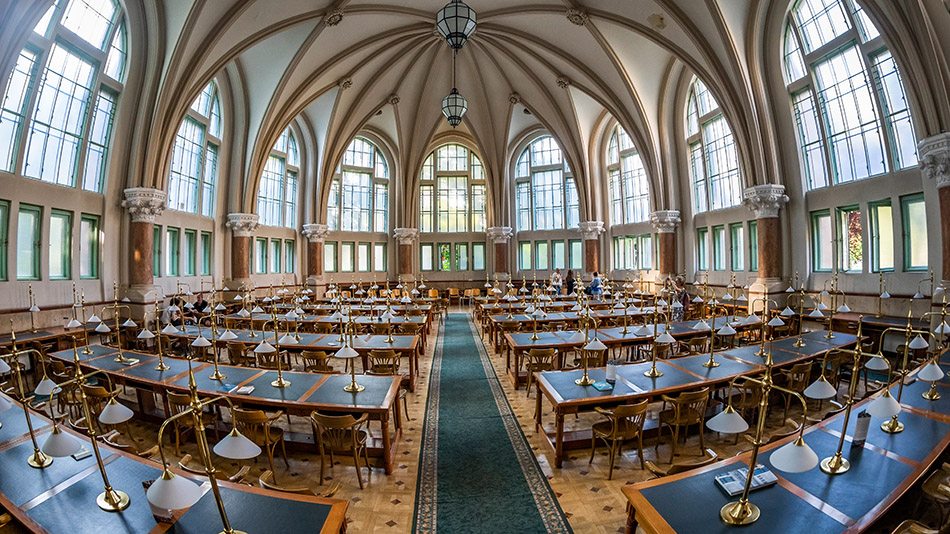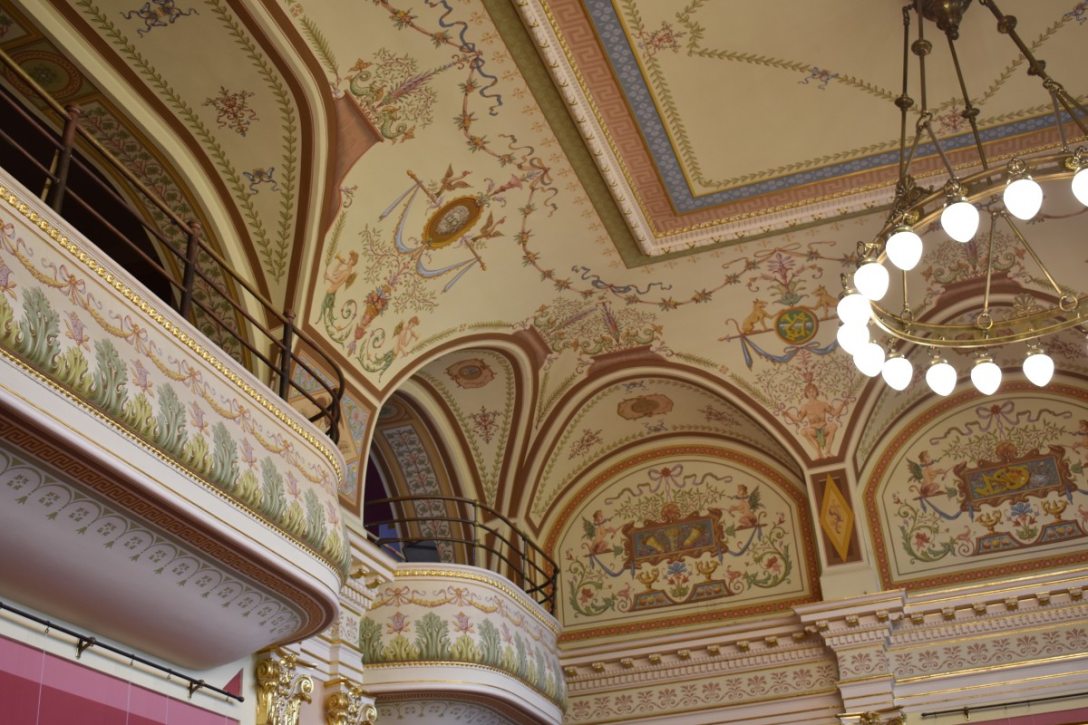 A díszterem egyik felén karzat, a másikon festett üvegablakok vannak. A terem mára visszanyerte eredeti szépségét: a tantárgyak allegóriái, a tudományok jelképei és a baglyok mellett a gazdag növényi ornamentika is visszakerült a falakra.