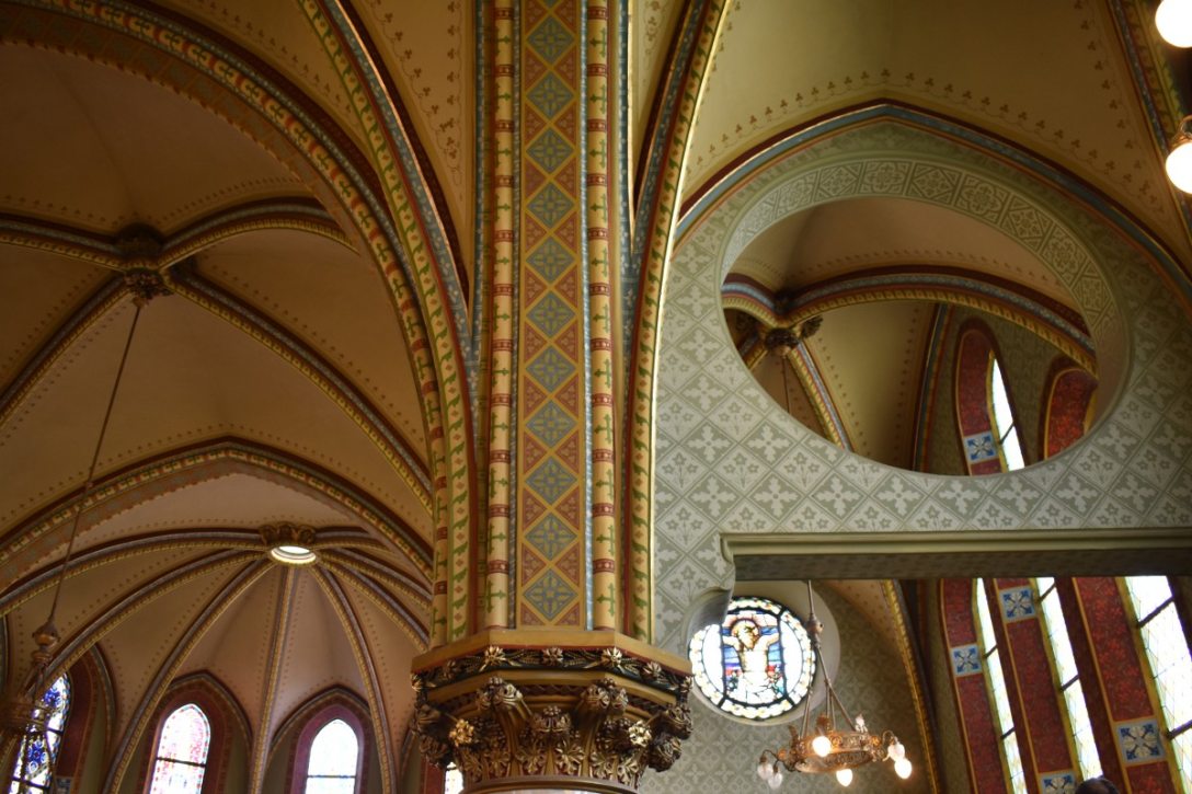 A színes falfestés mellett a festett üvegablakok és a Benczúr Gyula által készített oltárkép méltó különösen is említésre.