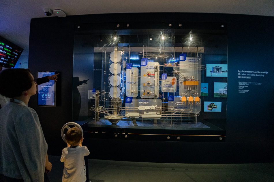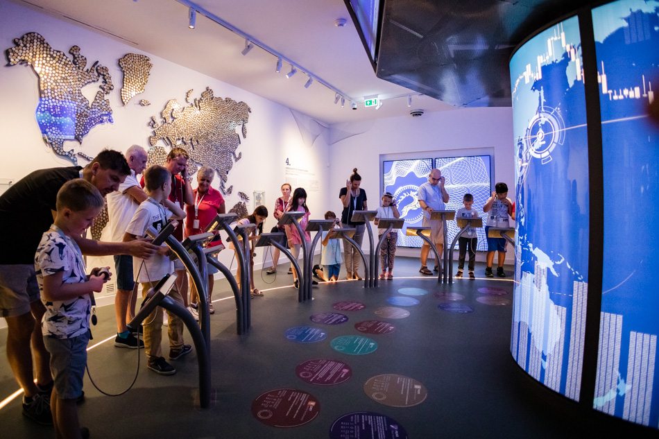 A következő részben a jelenbe és a jövőbe, a globális pénzügyi rendszerek, a világpénzek univerzumába lépünk be. A tőzsdén mi magunk is belekóstolhatunk a kereskedésbe: cégadatok és beérkező hírek alapján dönthetünk részvények vételéről vagy eladásáról. A fémpénzekkel kirakott világtérképen különböző országok fizetőeszközeit ismerhetjük meg. Az internetes vásárlást látványos installáció magyarázza el, attól kezdve, hogyan kerül a pénz a bankszámlánkra egészen addig, hogy kiszállítják nekünk a csomagot. A pénzügyi stabilitást egy csocsóasztalhoz hasonló szerkezeten teremthetjük meg, míg A pénz jövője – a jövő pénze című szekcióban a fintechről, azaz a pénzügyi technológiáról és a kriptopénzekről tudhatunk meg mindent, amit eddig nem mertünk megkérdezni.