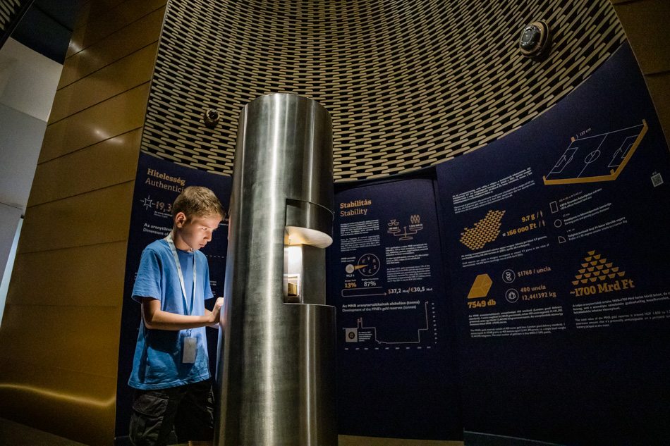 A legnagyobb attrakciót pénztúránk vége kínálja: ha bírjuk bicepsszel, megemelhetünk egy 24 karátos, 99,6 százalékos tisztaságú, 12,4 kilós aranytömböt. Ez a nagyobb Rama-kocka méretű aranytömb ma 250–270 millió forintot ér. Vajon milyen látványt nyújthat a 94,5 tonnát kitevő magyarországi aranytartalék, nem beszélve az ebben (is) világelső Egyesült Államok 8133 tonnájáról?