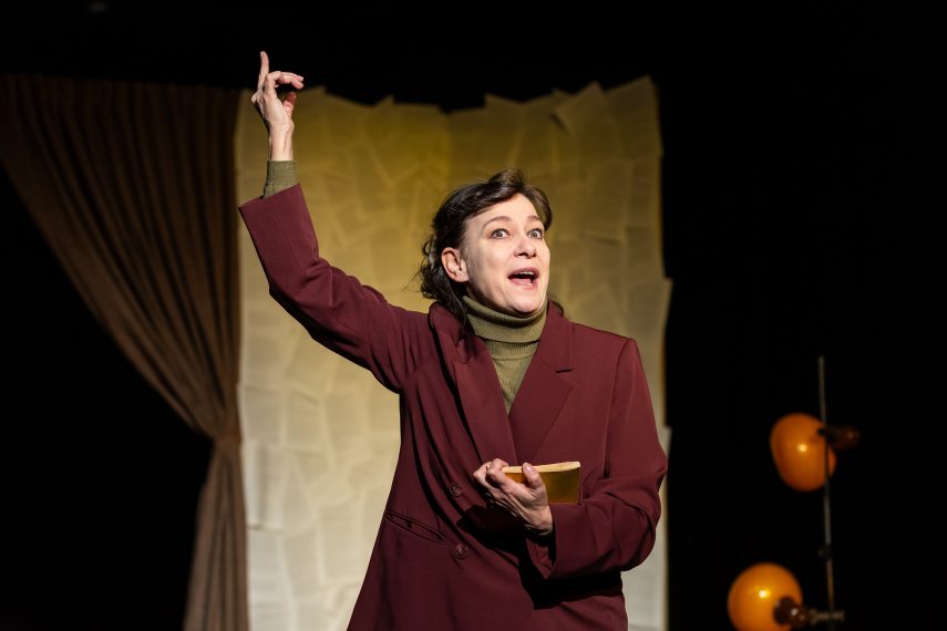 Simon Ferenc István díszlete – a világítással együtt – két részre tagolja a teret, és ez sokat segít a két egymásba fonódó történetszál elkülönítésében. A gépelt jegyzetekkel teleragasztott fal előtt álló íróasztal, lámpa, rádió és írógép mind egy évtizedekkel ezelőtti dolgozószoba részletét idézi. Fullajtár Andrea egyszerű szabású bordó nadrágkosztümje és kötött garbója is régi divat szerint készült, bár mindez hamar jelentőségét veszti, hiszen a színésznő játéka egy ma is érvényes, csaknem negyven évet felölelő történet minden pillanatában otthonosságot teremt. Az előadás erős atmoszférájához szervesen hozzájárul az akusztikus világa (zeneszerzők: Arleta Berndorff, Lelkes Botond, mdmx).