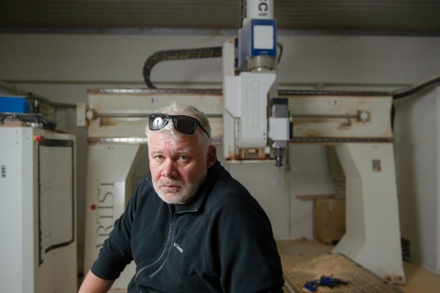 Sepsiszentgyörgyre érkezésünkkor autóban ülve vár, telefonon navigál bennünket a külváros felé, hogy új műhelyét megmutassa. Gépek zaja fogad: marók, fúrók szórják a forgácsot, az egyik padon dinoszauruszformák, a másikon stílbútorszerű díszítőelemek készülnek. Damokos Csaba izgatottan figyeli a gépek működését, akár egy órásira nőtt gyerek, aki a robotok világába csöppent.