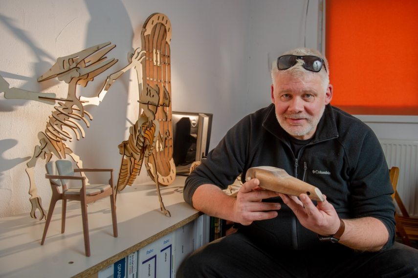 Egyedi irodabútoron dolgozunk, és közben bárpultot készítünk az olaszteleki Daniel Kastélyszállónak. A kollégák tervezőmonitorain és a lézervágóban pedig a barcarozsnyói őslényparkhoz készülő dekorációkat látod.