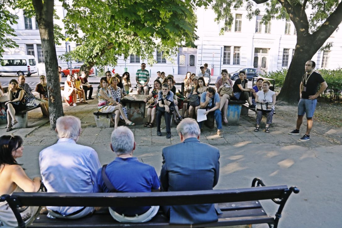 A séta első lépéseitől a család és a személyes történet mellett hangsúlyt kaptak Nemes Nagy Ágnes barátságai és mesterei – azok az írók, akikre felnézett, akik meghatározták világképét és költői alakulását. Jó volt elmerülni Babits Mihály és Pilinszky János világában, utóbbival közös utazásaik élményeiben – az ember egy pillanat alatt a római Aventinus-dombon vagy a szigligeti lugasban érezhette magát, miközben a Vérmezőn sétált vagy épp egy egykori cukrászda, étterem, presszó és lakás történetét idézte fel.
