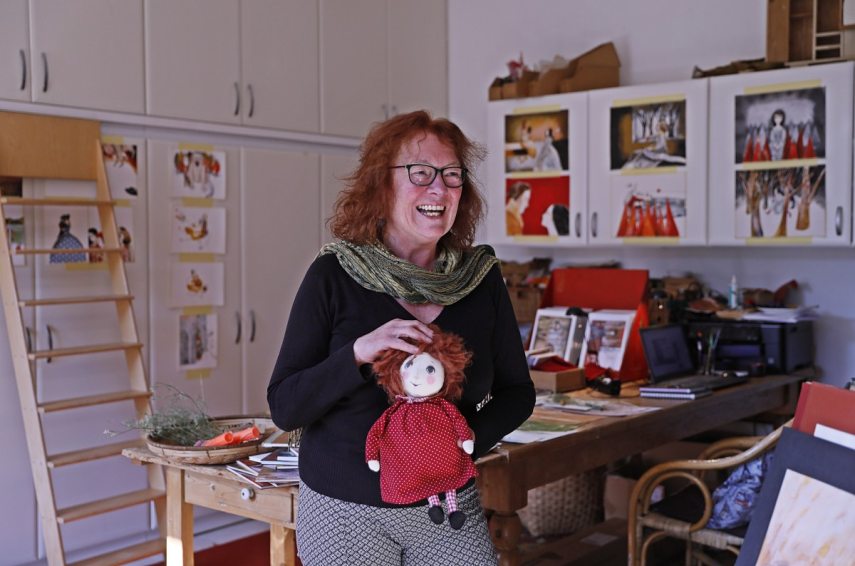 A hatalmas udvar, ahova megérkezünk, elvarázsolt erdőként fogad bennünket. Fenséges diófák, fenyők, gyümölcsös és nyírek rejtik a műtermet. Kitárul az ajtó, és egy egészen más dimenzióba csöppenünk: ezer szín elevenedik meg egymással harmóniában, a falakat képek borítják, ecsetek, ceruzák, festékhengerek hevernek mindenhol, nyomatok sorakoznak szebbnél szebb dobozokban, a könyvespolc a mennyezetig ér, bábok köszönnek ránk, aranyszőrű kutya heveredik a lábunkhoz. Amint leülünk beszélgetni, előbb egy bátortalan, majd egyre inkább elmosolyodó napsugár kukucskál be az ablakon. A falakra kirakósként felragasztott és az asztalon szétterülő vázlatok, háttértervek, készülő munkák felől érdeklődöm.