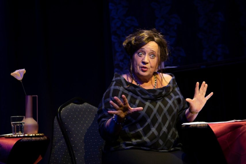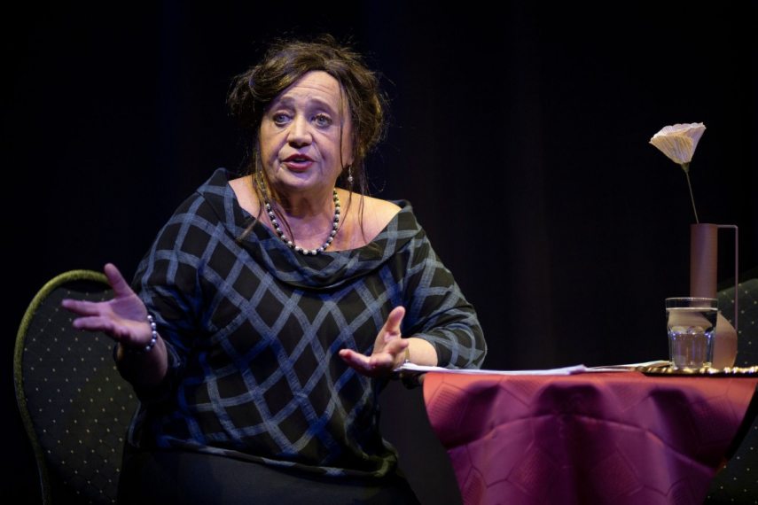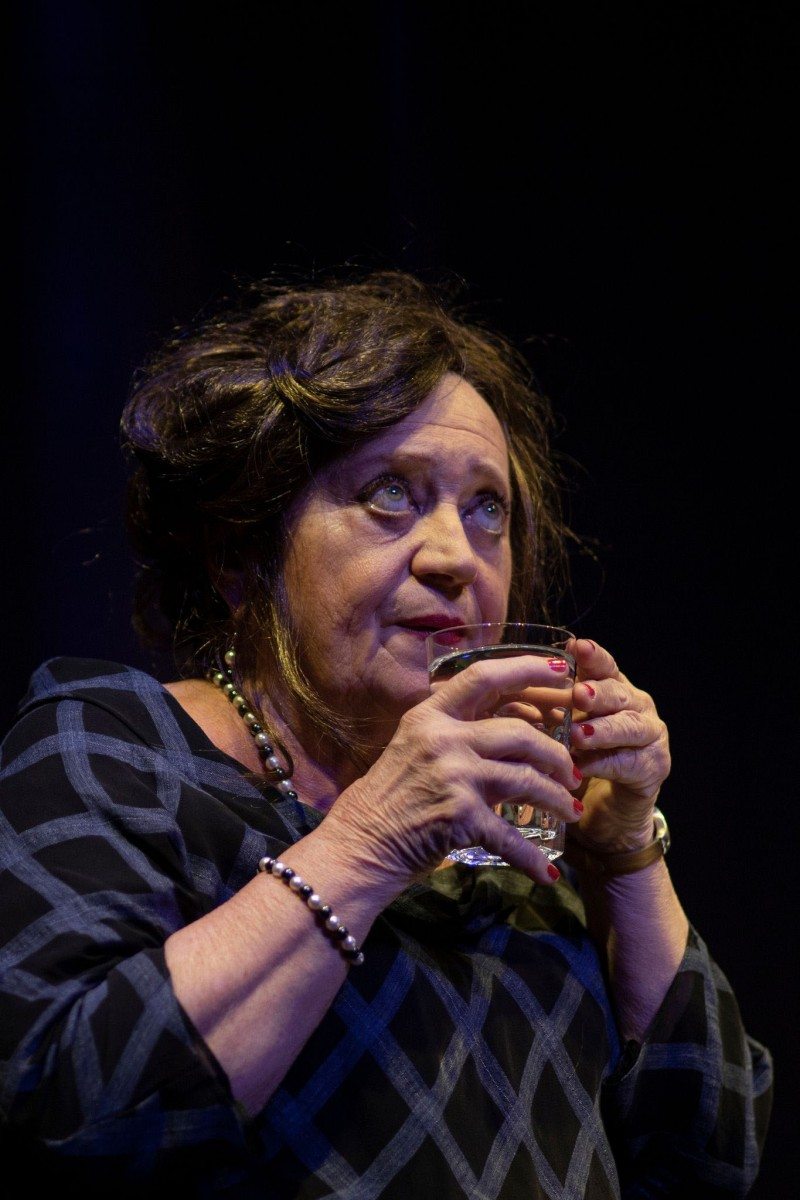Csákányi Eszter kezdetben kissé dekoncentráltnak tűnik, és mintha még csak keresgélné magában Albinát. De aztán egyre jobban belemelegszik, és a bűbájos, huncut mosolyú, csupa élet asszony negyed óra múltán egyszer csak ott ül a színpadon velünk szemben. Szemét néha nagyra nyitva, delejezően ránk pillant, és a tekintetében egyszerre van naiv ártatlanság és kiküzdött bölcsesség. Többet tud mindannyiunknál.