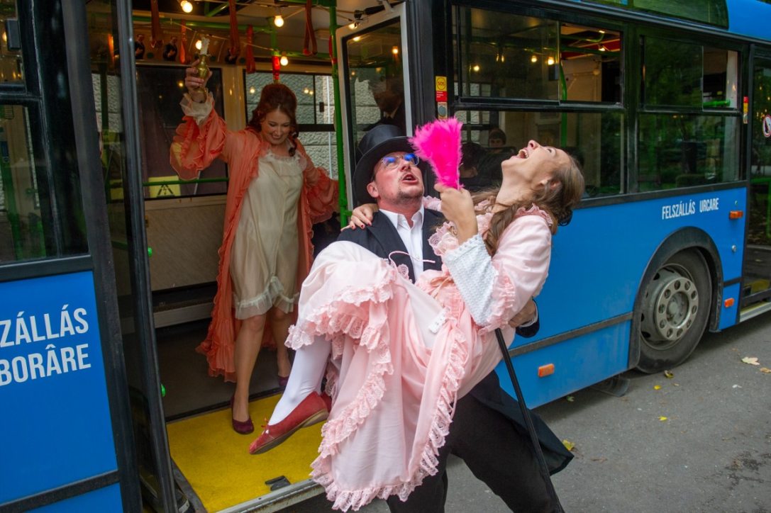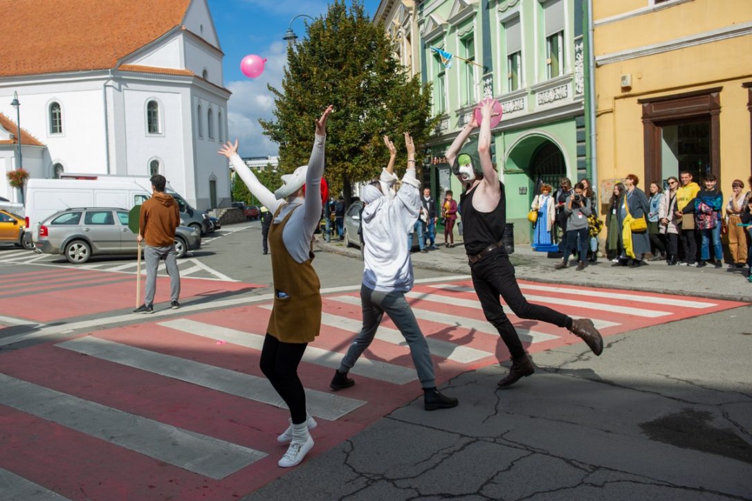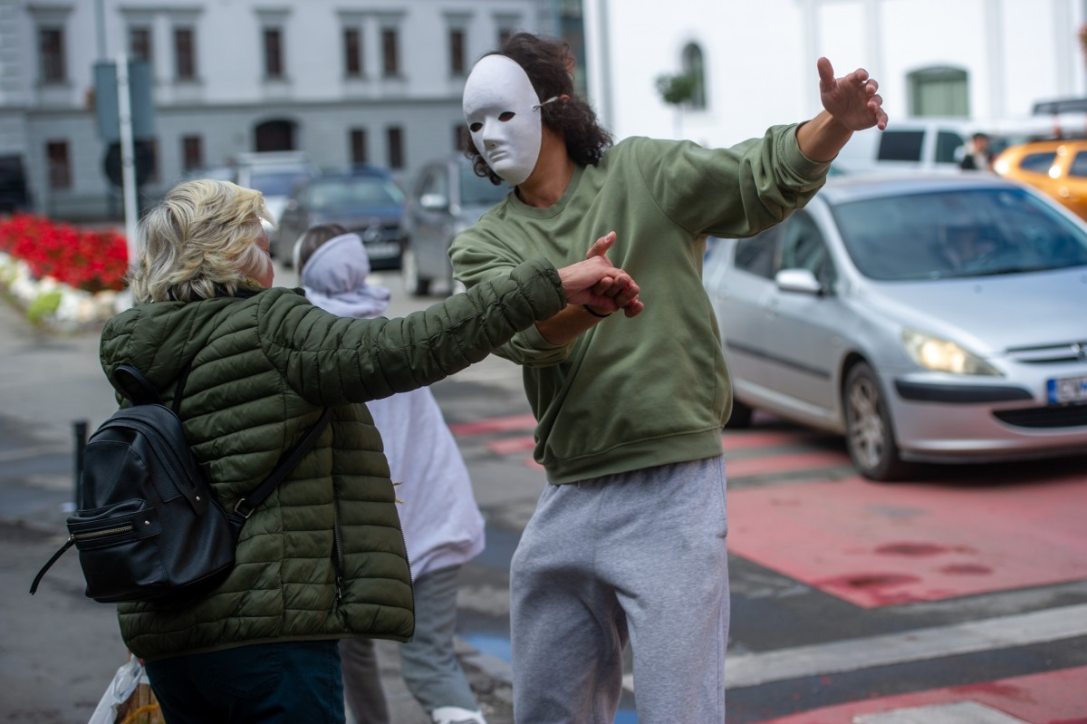 Nyitókép: B. Fülöp Erzsébet: Átjárószínház. Marosvásárhelyi színművészetis diákok utcai performansza. Fotó: Kultúra.hu/Beliczay László