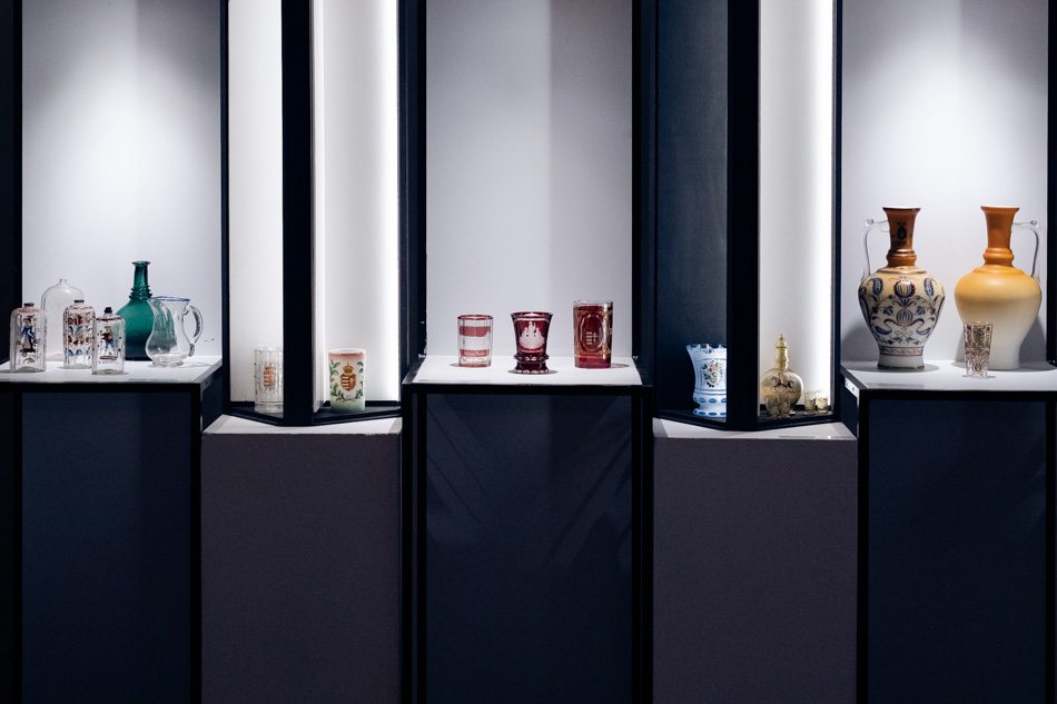 A tárlat történelmi visszatekintéssel indul. Az üvegmegmunkálás múltjába engednek bepillantást az első szobában, a téli ebédlőben megtekinthető tárgyak, amelyek dr. Sík Attila műgyűjtő kollekciójának részét képezik.