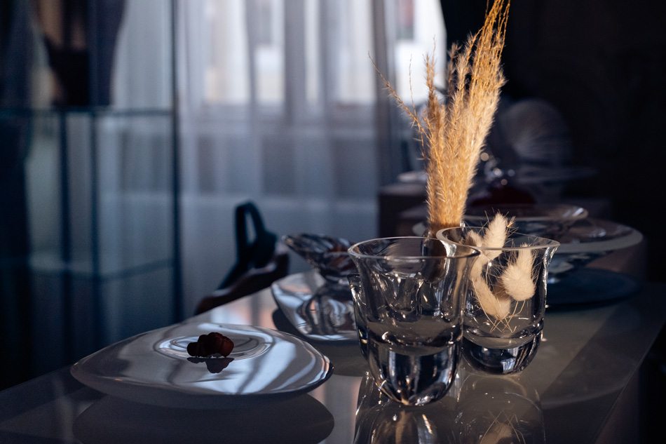 Ezek még a gyári üveggyártás termékei, szemben a többi, kortárs darabbal, amelyek már saját stúdiókban, hutákban készültek. A szoba másik felében már ilyen egyedi, modern és újszerű tárgyak reflektálnak az ebédlői tematikára.