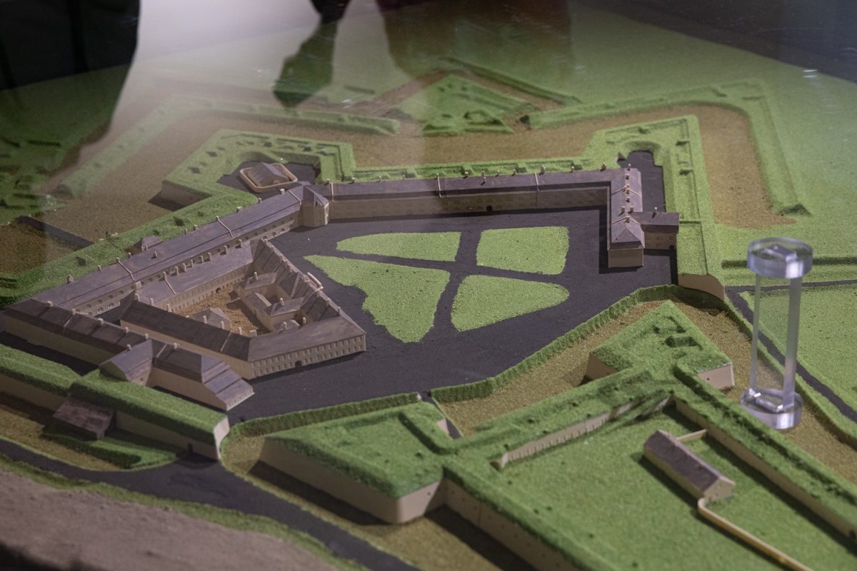 Az egyik felújított teremben hatalmas makett látható az erődrendszerről, különféle régi csákók, újabb kori szovjet katonai kulacsok és egy bőrdíszműves műhely társaságában. A modellen jól megfigyelhető, hogy az erődöt a Duna és a Vág összefolyásánál építették, ami igen jól védhetővé tette. Az Öregvár formára hasonlít a Gárdonyi Géza által megörökített egri várhoz, ennek a falai is teknősbékára hajaznak felülről nézve, de már a honfoglalás korában is lehetett ott egy földvár. Az ásatások azt bizonyítják hogy ötezer évvel ezelőtt is lakott volt ez a terület. Az Öregvár körül feltártak egy bronzkori vizesárkot, az Újvárban végzett ásatások során pedig kelta kori érméket és cserépégető kemencét is találtak. A 15. században Mátyás király építettett magának egy vadászkastélyt, de erről a reneszánsz palotáról sajnos semmilyen ábrázolás nem maradt fenn, és valószínűleg II. Szulejmán hadjárata idején pusztult el.