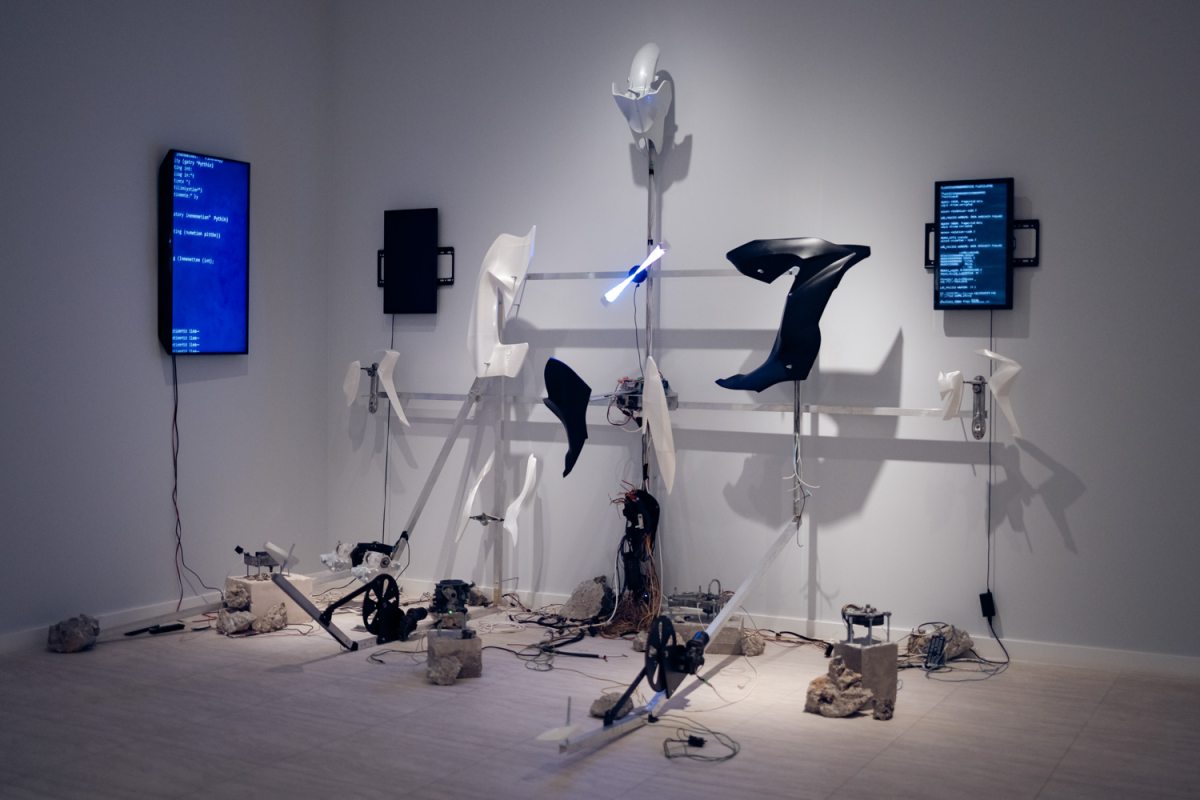 A poszthumanizmusra Városi Gabriella komplex, robotikus, az élő organizmus és a gép közötti hibrid identitást bemutató installációja a legszebb példa. A lény keserves és nyekergő mozdulatai küzdelemről tanúskodnak, kiszolgáltatottsága szinte tapintható.