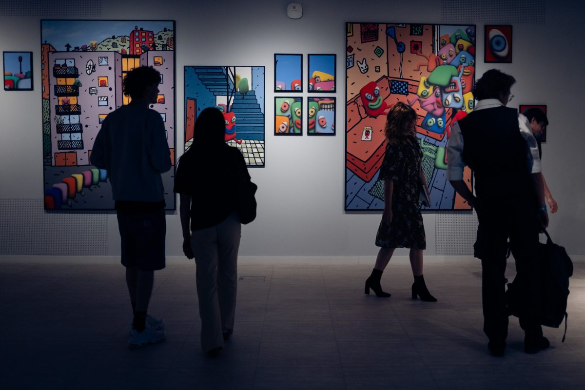 A földszinti terem poszthumanista vízióként is felfogható: a kiállított művek a halállal, az elmúlással és az élet utáni élettel foglalkoznak. Borzongatóak, sötét jövőt festenek, vagy disztópikus világot mutatnak be. Kozma Lilla átlényegíti, személyes perspektívából közelíti meg az utolsó ítélet hagyományos toposzát: a lila figurákkal megjelenített groteszk jelenet életének eseményeit felmutatva közelít a büntetés és a bűnhődés fogalmához. Kompozíciója dance macabre jelenetként is olvasható, emiatt működik jól Széll Tímea jelmezével és látványterveivel, amelyeket Ligeti György egyetlen operája ihletett. Elfajzott világot jelenít meg, ahol teljes az őrület és nincs kontroll, amit a vörös színek intenzitása húz alá. Pruzinsky-Plótár Péter elviselhetetlenül nyomasztó, szorongással teli és fenyegetően végtelennek tűnő orvosi váróteremben várja a sorsát.