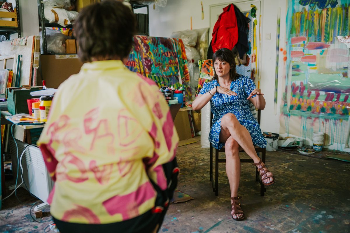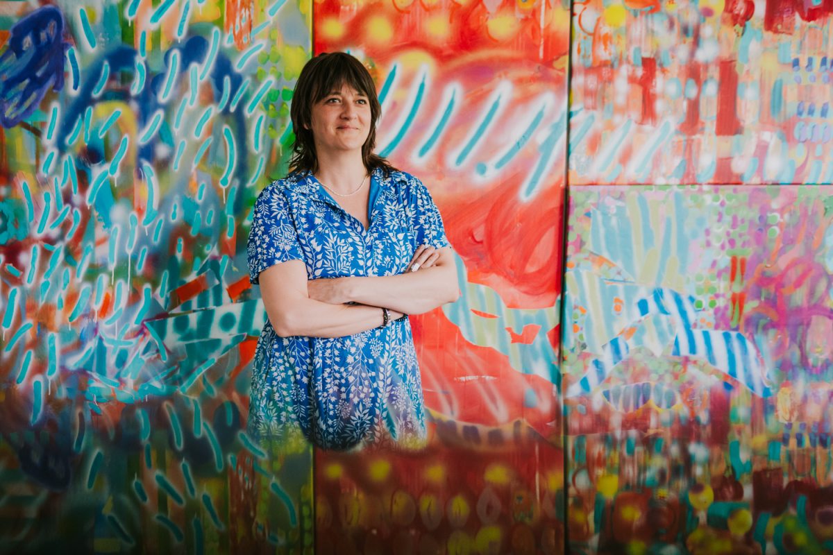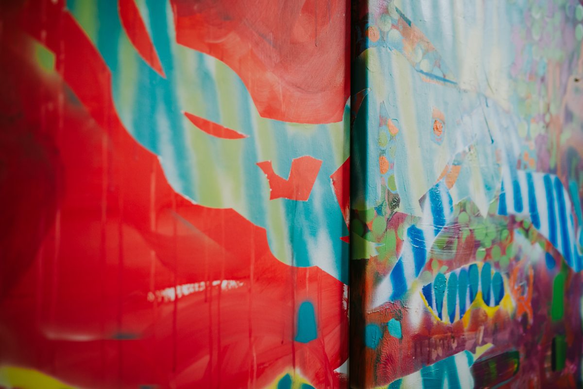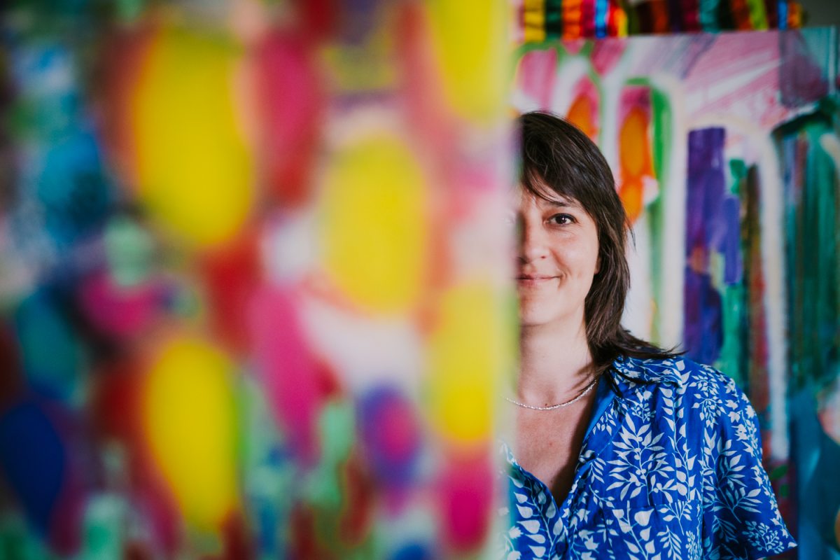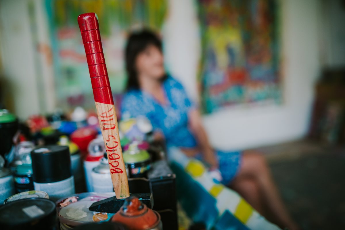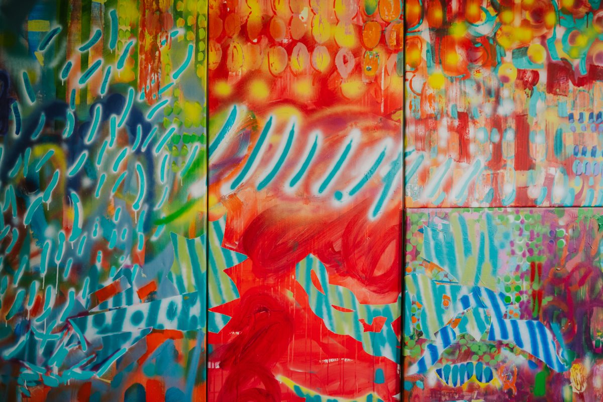 Bóbics művészetében az is nagyon izgalmas, hogy míg korábban a formák és a színek közötti párbeszédek domináltak a kompozíción, addig egy ideje újra felütötte a fejét a narratíva. „A Hajósi Művésztelepen töltött idő alatt indult el ez a sorozat. A szőlőbirtok régi présházában laktunk, és velem először fordult elő, hogy a természeti környezet inspirált, olyannyira, hogy azóta több festményen is megjelennek az ott kapott élmények, amelyek olykor konkrét motívumok formájában öltenek testet az egyes kompozíciókon. A kör és gömb alakú fújások például a szőlőszemeket idézik, de megjelent a távlati kép visszaadásának szándéka is. Izgalmas, ahogyan az egyes fragmentumok kiadnak egy történetet.”