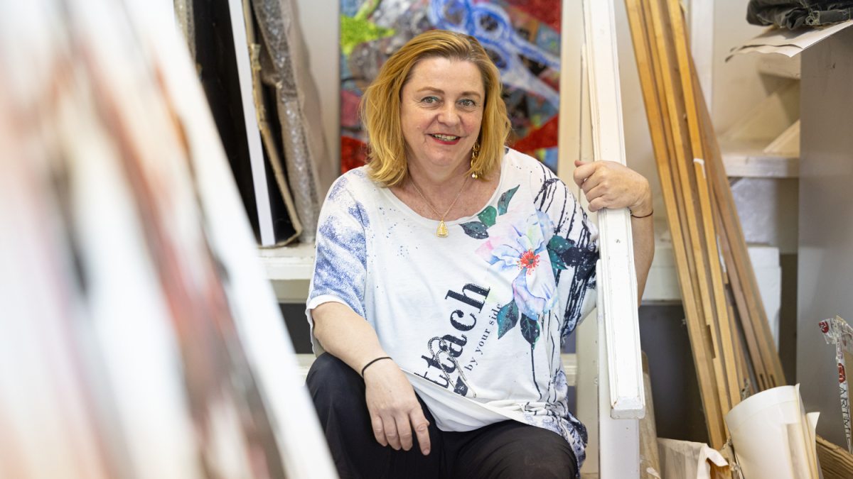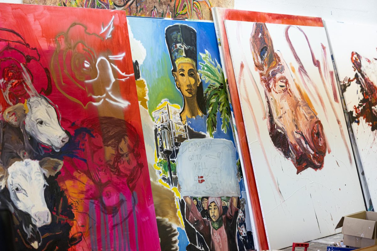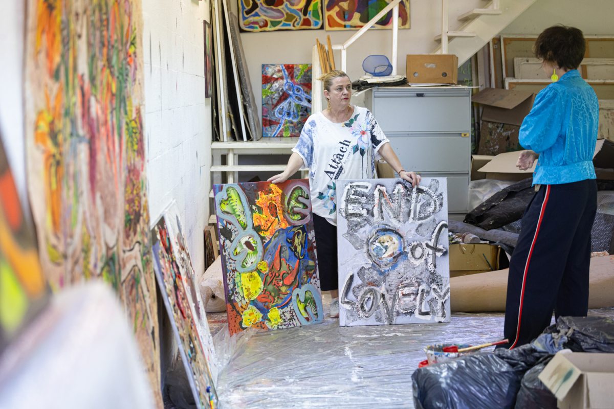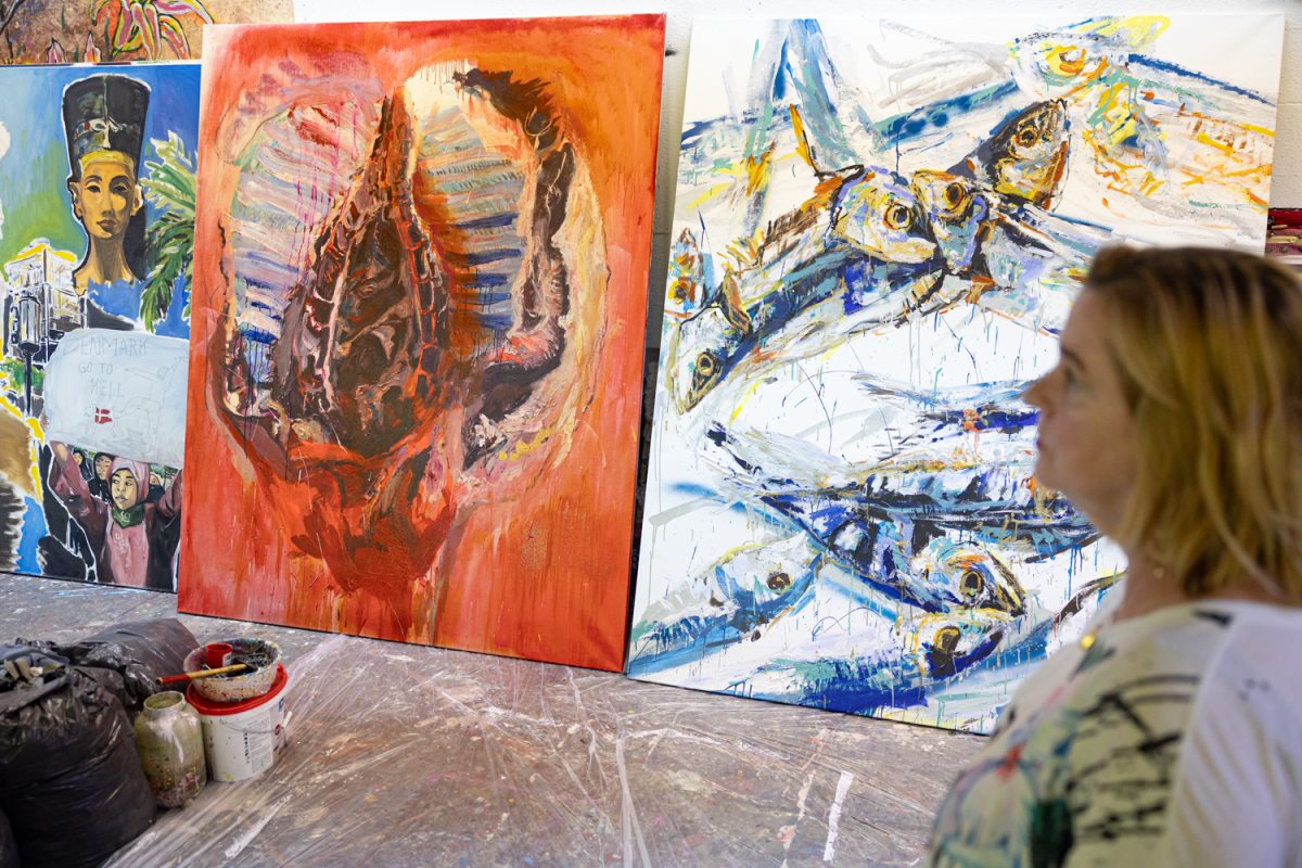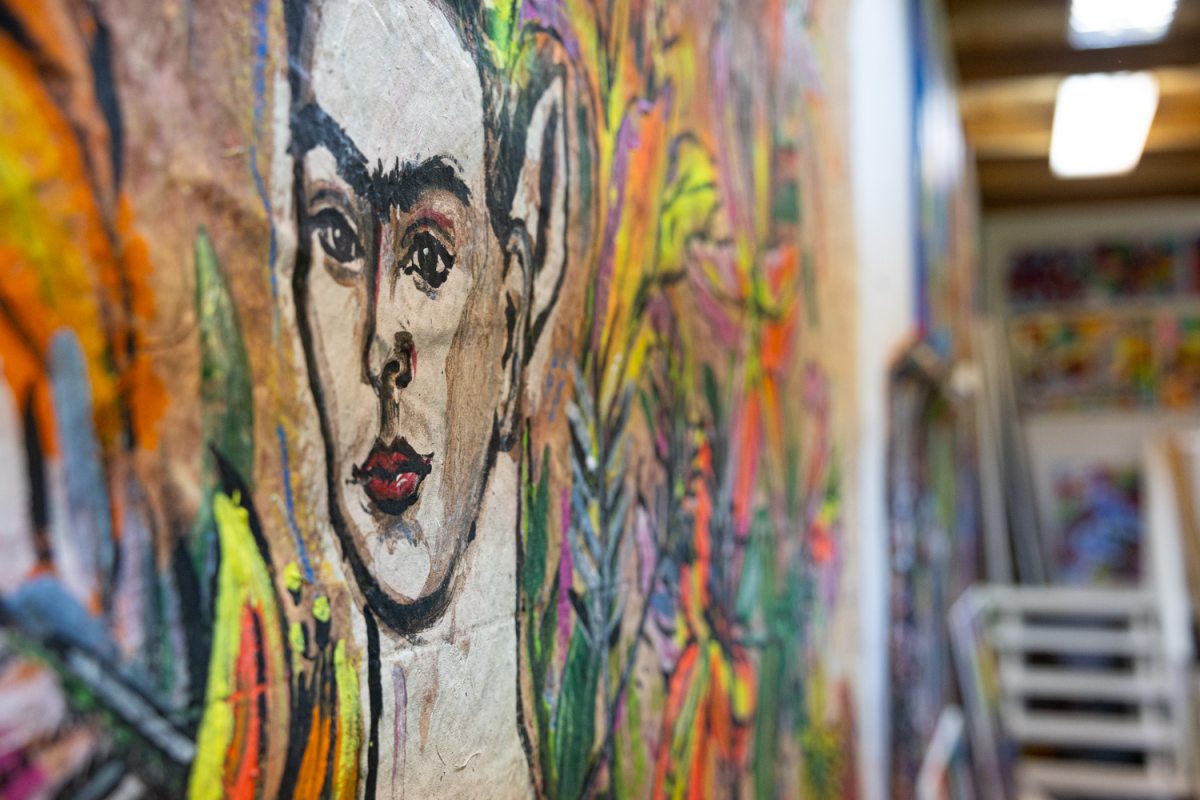 A műterem felső szintjén találhatók ezek a kivételesen nagy méretű, összetett munkák, amelyek emeléséhez, megnézéséhez ketten kellünk, mégis nagy lelkesedéssel fogom és viszem a vásznakat, hiszen mindegyiken végtelenül komplex univerzum tárul fel. „A barátnőmnek van egy textilfeldolgozó üzeme, és amikor hazaköltöztem, elmentem hozzá, mert mondta, hogy tud vásznat adni. Én pedig megláttam, hogy zsákokban áll nála a különféle textilhulladék, olyan elemek, amiket a gép nem tud feldolgozni. Gyönyörűnek találtam, ezért hazahoztam mindet, majd idővel elkezdtem beleapplikálni őket a képeimbe.”