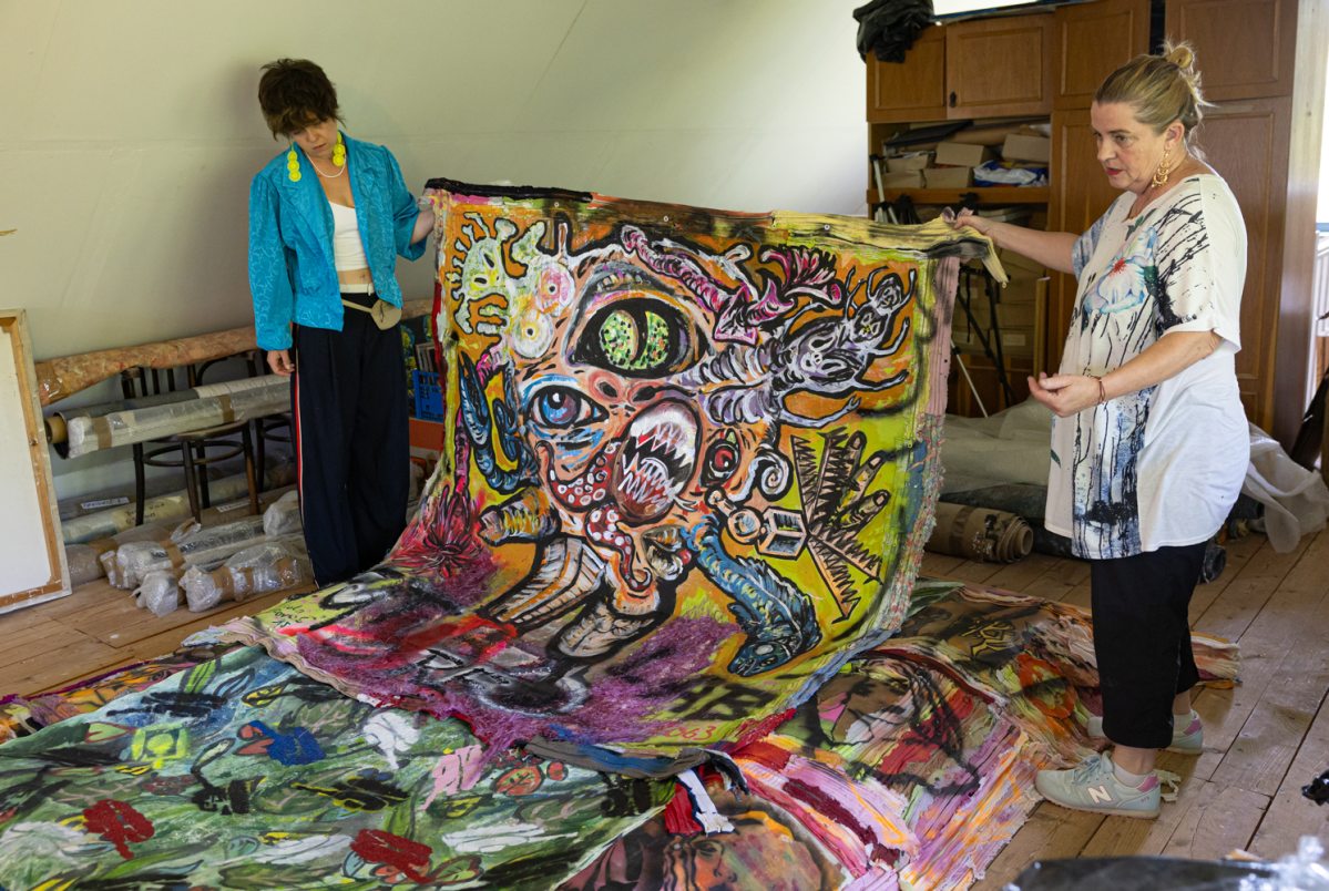 Egészen elképesztő élmény belépni ebbe a térbe, ahol minden sarokban van valami különleges: újrahasznosításból visszamaradt anyagok, nagy vödörben szikrázó csillámpor vagy épp harsány színű festékestubusok. A földön épp egy készülő mű: régi hímzett csipketerítőkből épül az új kompozíció, amelyet jellemző módon cipzárdarabok kereteznek. Boros Viola 2009-ben, Németországból hazatérve kezdett újrahasznosításból kimaradó ruhadarabokkal, kardigánokból kivágott cipzárakkal, gombokkal, felvarrókkal, hímzett terítőkkel, mintás feliratokkal dolgozni: megszülettek a gazdag felületű, keleties hatású, de a popkultúra vizualitását is felhasználó szőnyegképek, amelyeken a varrt alapra folyamatos rétegekként kerültek fel ezek az elemek, valamint az akrillal, UV-reagens pigmenttel és sprayjel felfestett figurák és feliratok. E sok-sok anyagdarabból, fragmentumból, hímzett és fújt részletekből, csillámos és flitteres elemekből felépülő, tarka és harsány faliszőnyegkollázsok mediálisan is a női munkát idézik, ugyanakkor sűrűségük és vadságuk felülírja a klasszikus sztereotípiákat, a témák pedig gyakran érintenek társadalmi jelenségeket, ökológiai és genderkérdéseket, jellemzően aktuális eseményekre reflektálva.