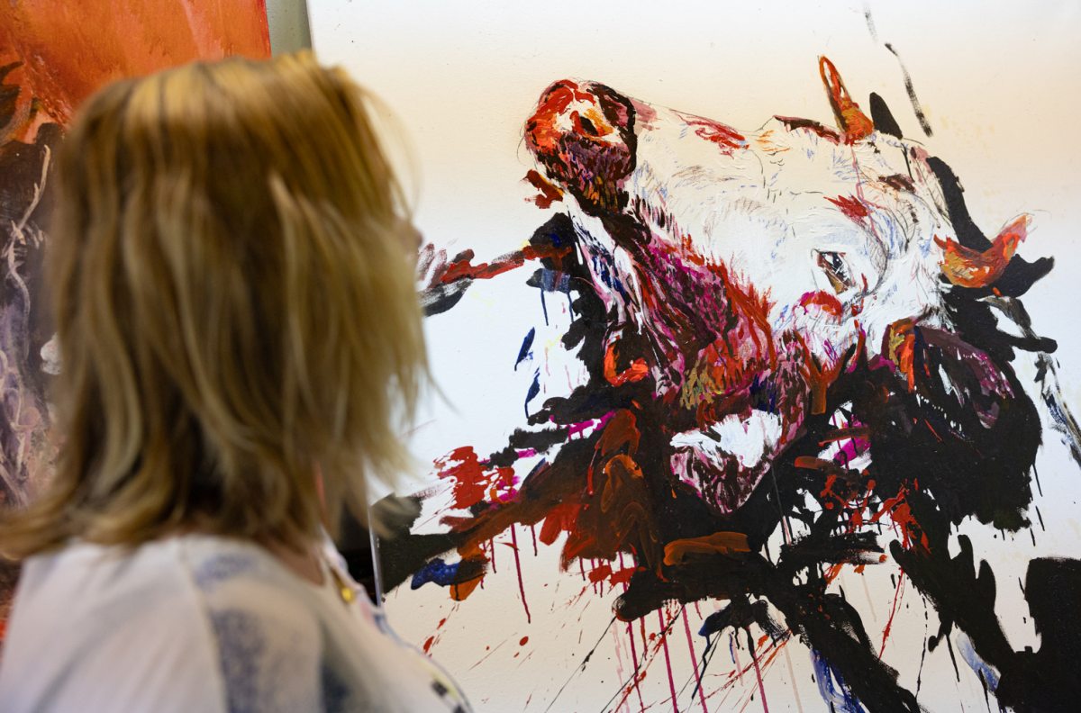 Feminista hangvételűek Frida-képei is. Boros Viola 2015 óta készít Frida Kahlo munkásságára reflektáló műveket. Ahogy Bordács rámutat: „A kötődése a festőnőhöz nagyobb részben a betegség- és a nőiségvonal mentén történik, kisebb részben a természethez való intenzív viszony nyomán.” Boros megmutat egy hatalmas vásznat, amely a mexikói festőnő A megsebzett szarvas című festményének parafrázisa: itt az íjakkal meglőtt állat csodálatosan pompázó liliomok között látható. „Két Frida fiestás kiállításom is volt 2017-ben, Bordács Andrea esztéta volt a kurátoruk, ő hozott össze minket a kiállítások kapcsán Fajgerné Dudás Andival. Míg a Szombathelyi Képtár hatalmas terei lehetővé tették a Fridával kapcsolatos összes nagy méretű képem kiállítását, addig a veszprémi Csikász Galéria boltíves terei a bensőségesebb munkák számára voltak optimálisak.”