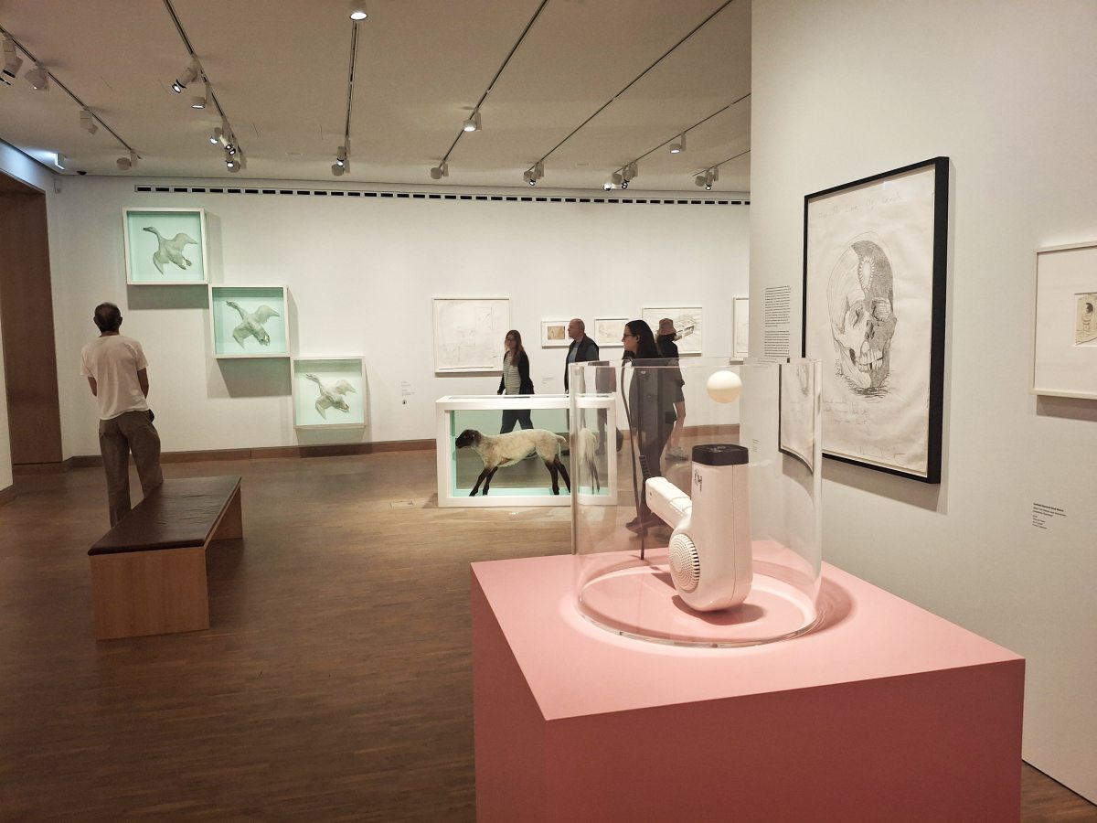 Mert Hirst rajzai nem csupán előtanulmányok, vázlatok – inkább gondolati lenyomatok, amelyek a koncepció első felvillanásait rögzítik, más esetben viszont önálló műként is megállják a helyüket. Vannak olyanok is, amelyek utólag készülnek, mintha visszafelé fejtenék meg, mi is történt valójában. A rajzolás pedig széles spektrumon mozog, az ösztönös, automatizált firkáktól a tudatosan szerkesztett tanulmányokon át a stúdió által kivitelezett, már-már mechanikus munkákig. Ezekből mind láthatunk szép példákat ezen a kiállításon.