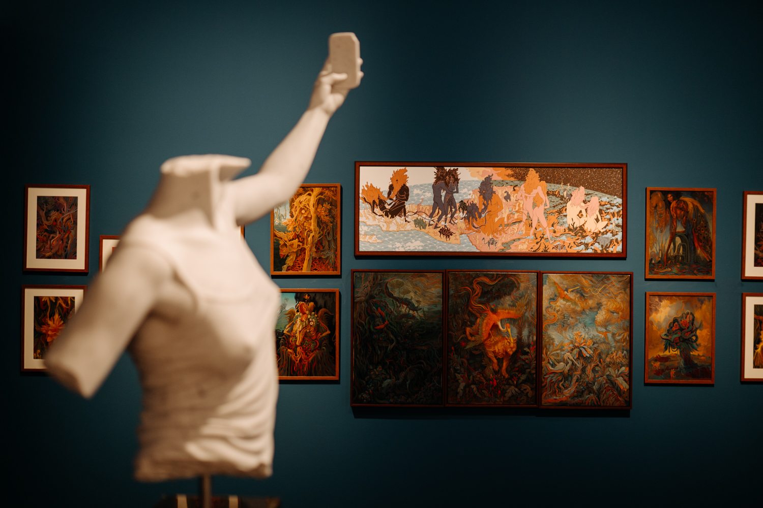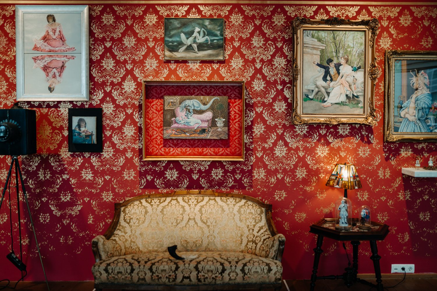 Karácsonyi László például egy gondosan berendezett, historizáló enteriőrt álmodott meg: barokkos tapéta, elegáns szalonbútorok, egy múltidéző, harmonikus világ, ahol első pillantásra minden a helyén van. Ez azonban csak a felszín. Ahogy a tekintet elidőz a részleteken, az idill lassan megbillen: a kanapéból kés pengéje villan ki, apró groteszk szörnyfigurák és hibrid lények lepik el a teret. Ez a „horror rokokó” világa, ahol a szépség és az erőszak, a nosztalgia és a fenyegetés egyazon térben léteznek, zavarba ejtő természetességgel.