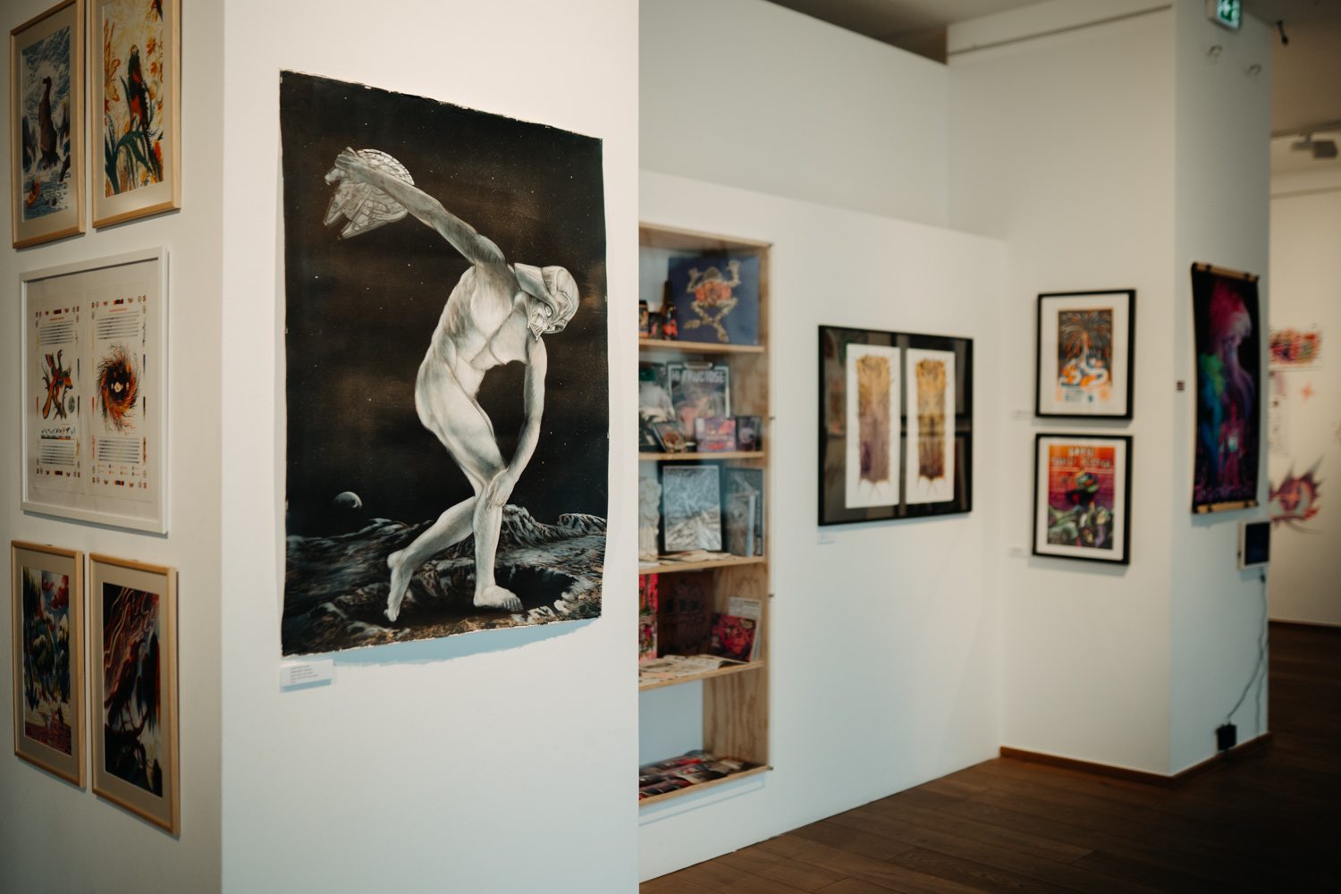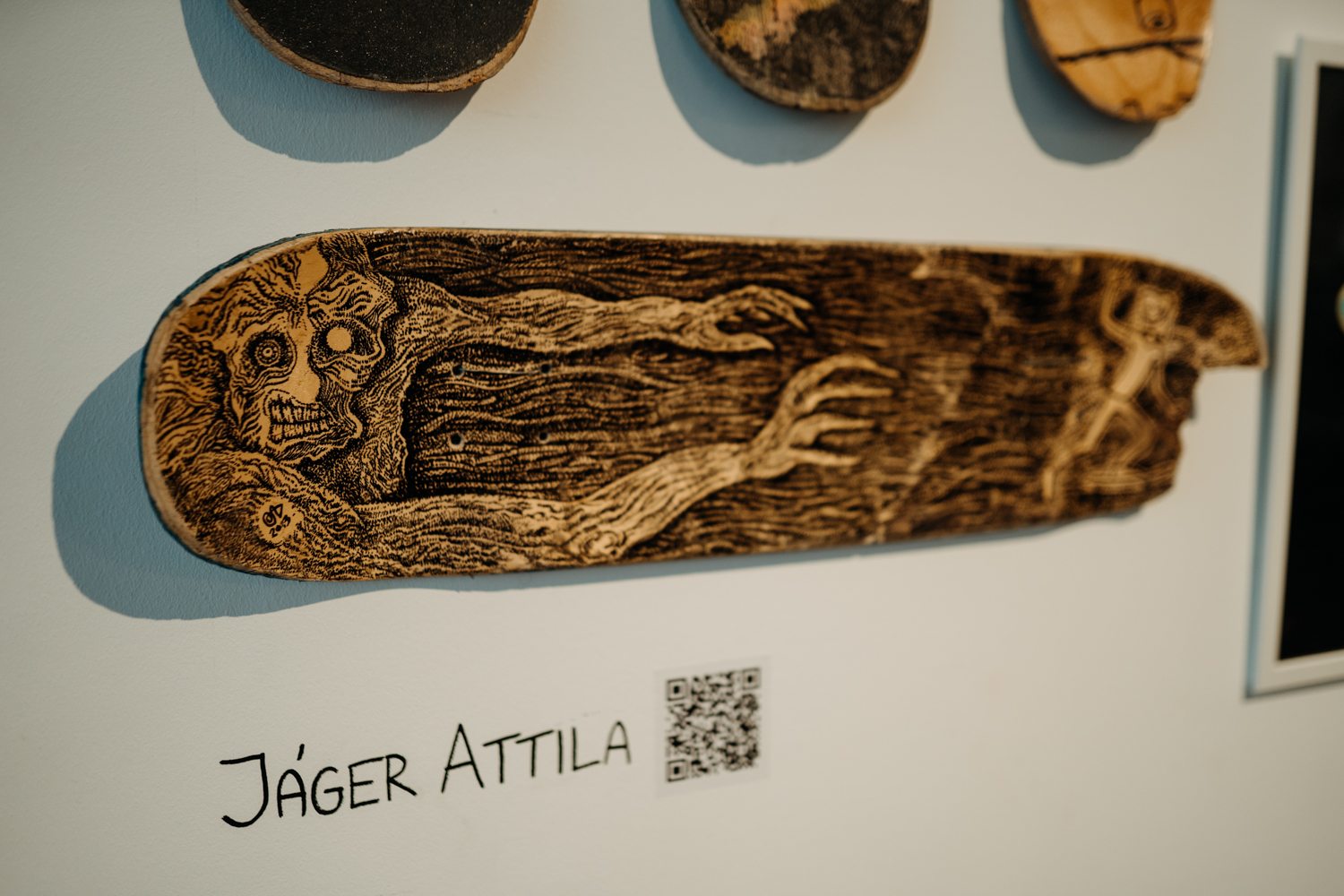 Jáger Attila munkái tovább tágítják ezt a sokrétegű teret azzal, hogy a képregényes gondolkodást szó szerint különféle hordozókra ültetik át. A kiállításon szereplő gördeszkák nem pusztán felületek, hanem aktív részei a műveknek. A sérülések, kopások és törések beépülnek a kompozícióba. A fekete-fehér horror vacui rajzok, a furcsa, álomszerű lények és a visszatérő motívumok egy személyes mitológia elemeiként jelennek meg. A papír, a fal és a deszka egymás mellettisége tovább gazdagítja a kiállítás bestiáriumát. A deszkás gondolatmenetre illeszkedik az a szekció is, ahol a Converse márka ikonikus darabjai jelennek meg.