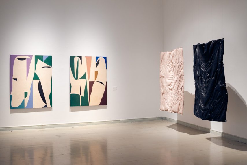 Az első térben szerepelnek Kiss Adrian steppelt textilszobrai, amelyek egyszerre idéznek meg egy nosztalgikus szituációt a teregetés asszociációja mentén, ugyanakkor a műbőr és a felületén megjelenő maszkulin formavilág futurisztikussá is teszi ezeket az alkotásokat. Kiss szobrai mellett remekül működnek Süveges Rita bársonyképei, amelyeken motorroncsok krómosan fénylő felületei jelennek meg. Az agresszív, maszkulinitáshoz kötődő formavilág és a bársony lágysága, selymessége erős oppozíciót hoz létre.