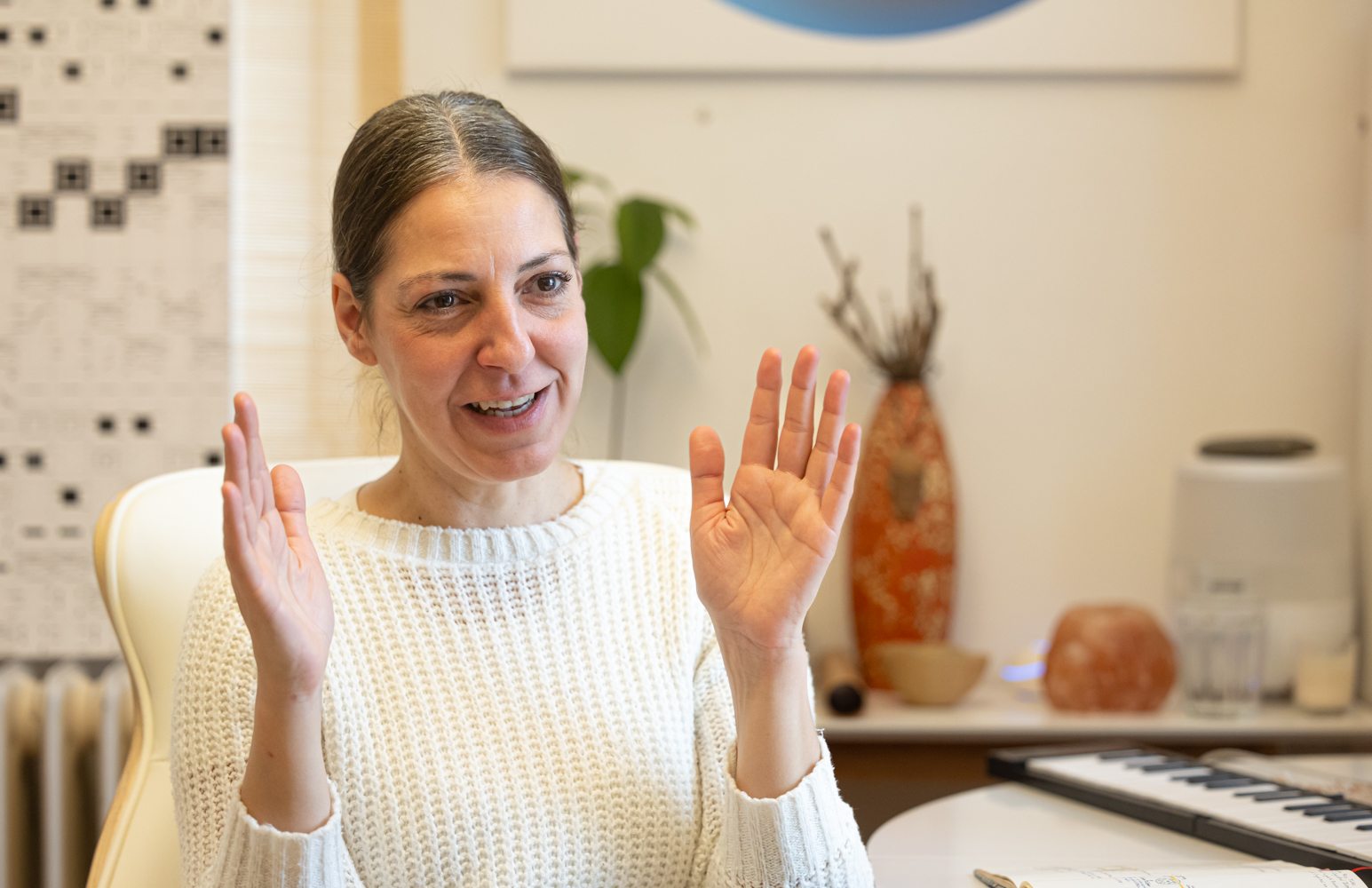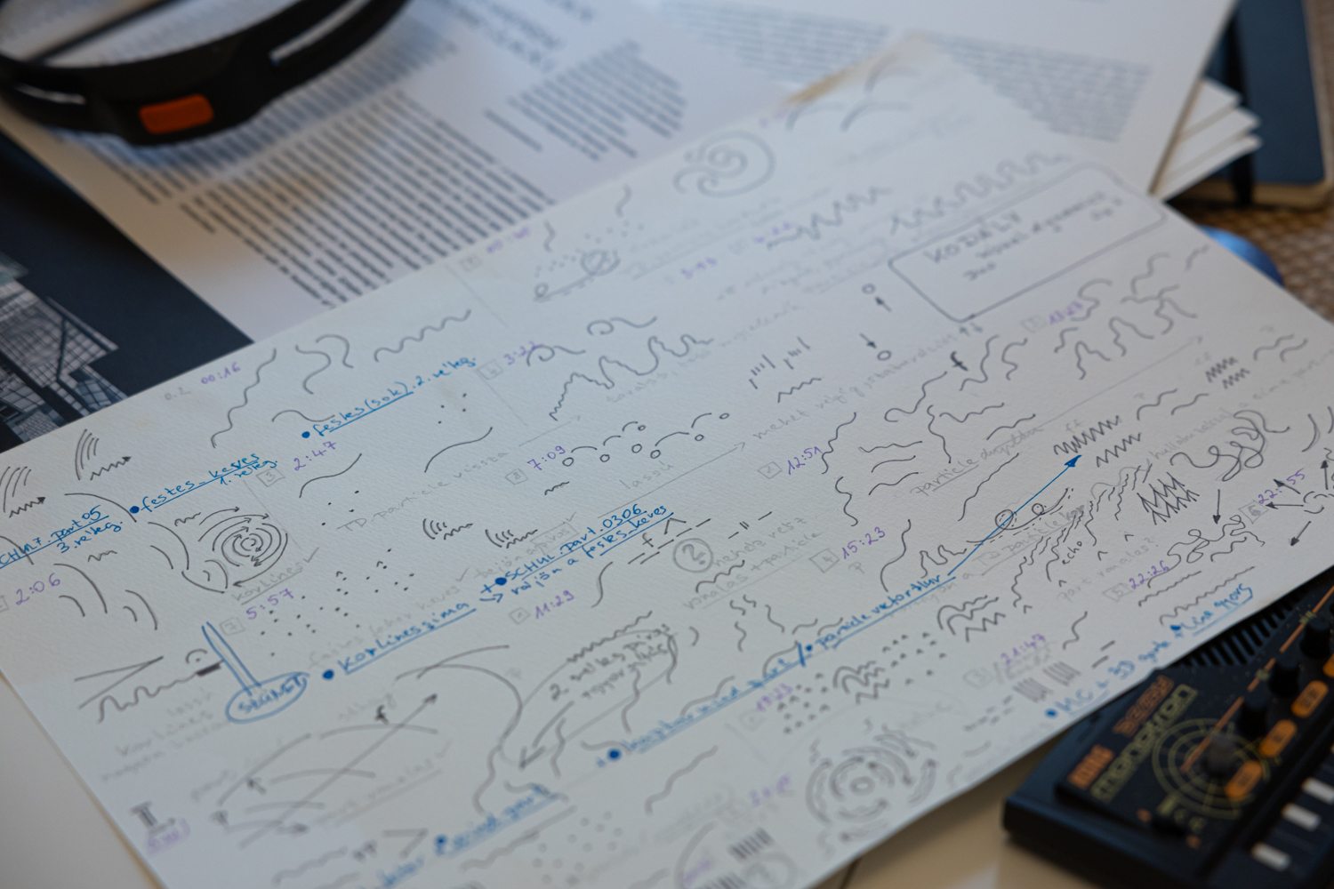 „Nálam két, egymástól nem teljesen különálló rétegből áll össze az, amit csinálok” – mondja Sztojánovits Andrea, miközben sorra veszi elő a rajzait és a „munkaeszközeit”, a hordozható zongorát, kézi szintetizátort, agyszenzort. „Az egyik egy nehezen megfogható, transzcendensebb tapasztalat, az érzet szintje. Személyes élményekből, tapasztalatokból indulok ki, amelyek újra és újra visszatérnek”. Izgatják az olyan különféle érzékelések, mint a csukott szemmel látás tapasztalata, a szokatlan, nem mindennapi megélések. „Nekem ezek olyanok, mintha valahogy kapcsolódnék egy másik dimenzióhoz.”