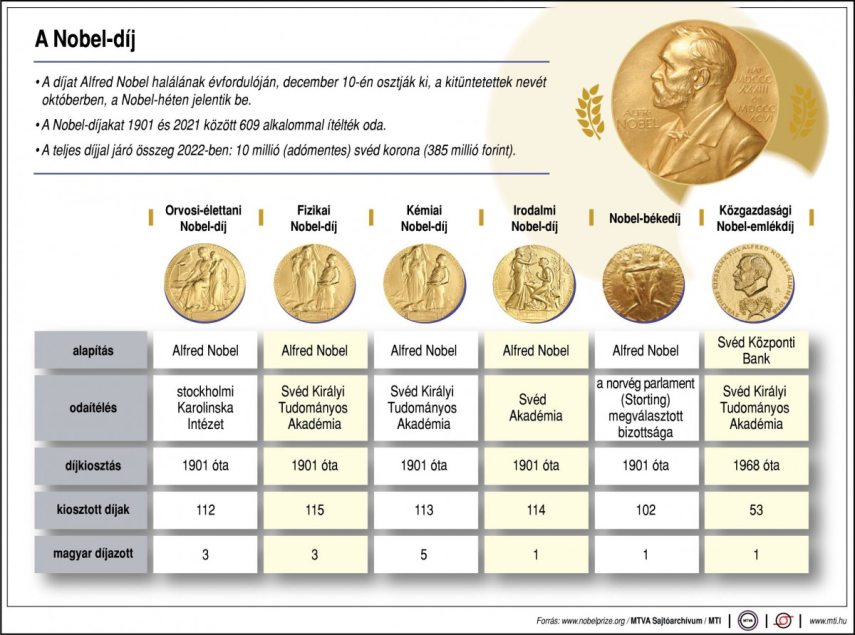2022-ben október 3. és 10. között jelentik be, hogy kik kapják a Nobel-díjakat. Elsőként az orvosi-élettani kategóriában hirdetnek nyertest Stockholmban, kedden a fizikai, szerdán a kémiai Nobel-díj kitüntetettjeit ismerteti a Svéd Királyi Tudományos Akadémia.