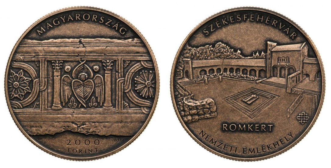 Székesfehérvár, Romkert Nemzeti Emlékhely megnevezéssel kétezer forint névértékű, bronzpatinázott színesfém emlékérmét bocsátott ki hétfőn a Magyar Nemzeti Bank. A magyarországi nemzeti emlékhelyeket bemutató sorozat a Nemzeti Örökség Intézete kezdeményezésére 2014-ben indult, a most megjelenő darab a sorozat kilencedik eleme. A Székesfehérvár alapításának 1050. évfordulója alkalmából megjelenő emlékérmét Szabó Virág szobrászművész tervezte.