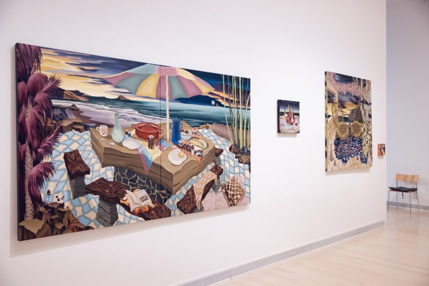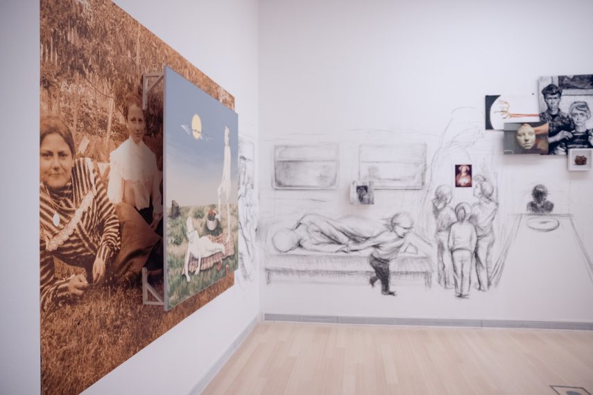Nagyon élvezem például, hogy Marosi Panni álomképekből táplálkozó, szürrealisztikus, olykor pedig egészen kísérteties kompozíciói találkoznak Czene Márta hatalmas installációjával, amelyben a transzgenerációs traumákat és fájdalmakat szálazza szét. Ebben a térben a gyermekkori félelmek találkoznak a lidérces tájakkal, amelyek szorongással vegyes borzongással töltenek el. Mindkét művészi világ forrása a személyes élményanyag, a múlt, s mindkét alkotó bizonyos szempontból foglalkozik az emlékezet működésével. Bár Marosinál inkább az ember nyomát viselő, mégis kiüresedett tájak dominálnak, Czenénél pedig a figurák, mindketten erősen narratív műveket hoznak létre.