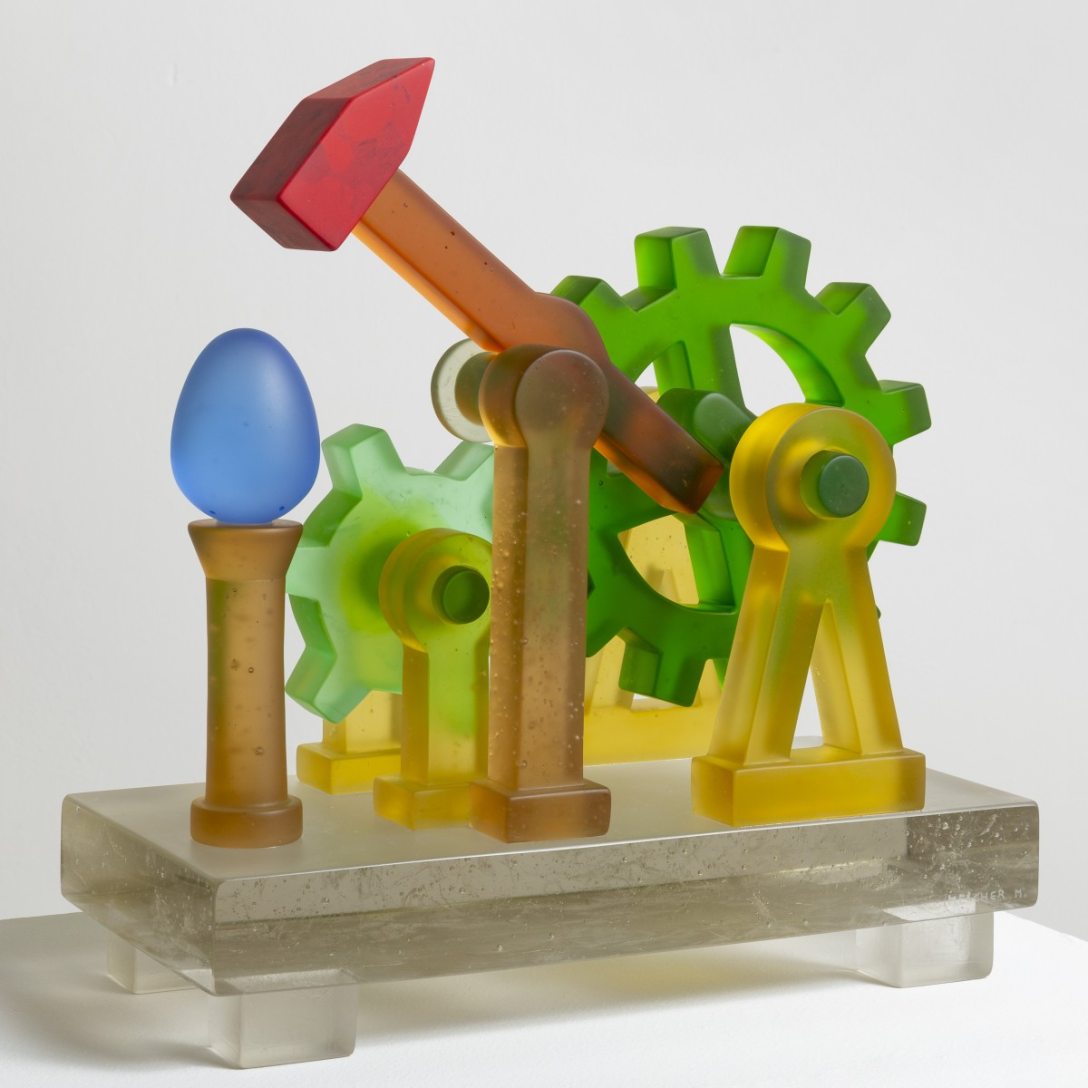 „Az üvegművészekről elmondható, hogy mindenkinek saját technikája van, és azt ő tudja a legjobban” – hangsúlyozza aztán. A formába olvasztás technikáját használja az itt kiállító Melcher Mihály, aki szívesen utal vissza az egyiptomi technológiára: negatívban elkészíti a formát, és ebbe teszi az üvegtörmeléket, ami hő hatására összeolvad. „Az a nagyobb méret azonban, ami Melcher munkásságában megjelenik, több évtizedes munka, kísérletezés eredménye, hiszen hatalmas tapasztalat áll amögött, hogy pontosan tudja, milyen tempóval, sebességgel kell a kemence hőmérsékletét fölvinni, majd ugyanolyan pontossággal csökkenteni. Az eredetileg festőnek készült és Szentendre közelében, Csobánkán élő művész kötődését a városhoz az Hommage a Deim Pál című munkája is tükrözi” – teszi hozzá a kurátor.