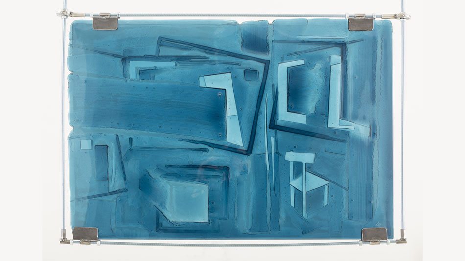 Érkezés című, szintén rogyasztott plasztikája valójában már egyetlen képjel, teljes elvonatkoztatás, amely megmutatja, hogy ezt is lehet üvegből csinálni. A tárlatot lezáró falon való elhelyezése pedig egyfajta végpontja az üvegről való gondolkodásnak, továbbá mintegy lezárása a kiállításnak.