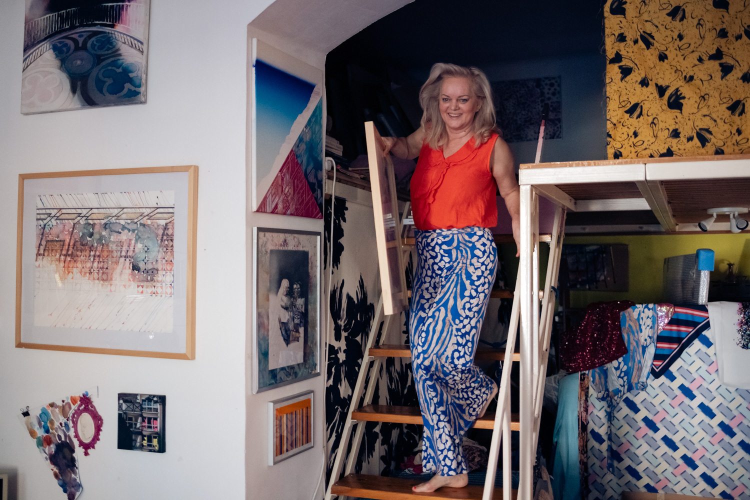 Innen mutatja azokat az erotikus képeit, amelyeket egy szerelem inspirált, majd a nőművészet-feminizmus kérdéskörére kanyarodunk. Azt mondja, mivel teljesen megéli nőiességét, egyben van benne a nő az emberrel, nem érzi szükségét, hogy képei „sajátos női tapasztalat” kifejezői legyenek. „Néha elnézem a képeimet, és azon kapom magam: úristen, milyen szépelgők. Ez talán összefügg a lassú munkamódszerrel, azzal, hogy nem állva, energiától fűtve dolgozom, hanem ülve, nyugodtabb ritmusban. Nem tudok vad lenni, mint Reigl Judit, akinek a gesztusaiban ott a kitörés ereje.