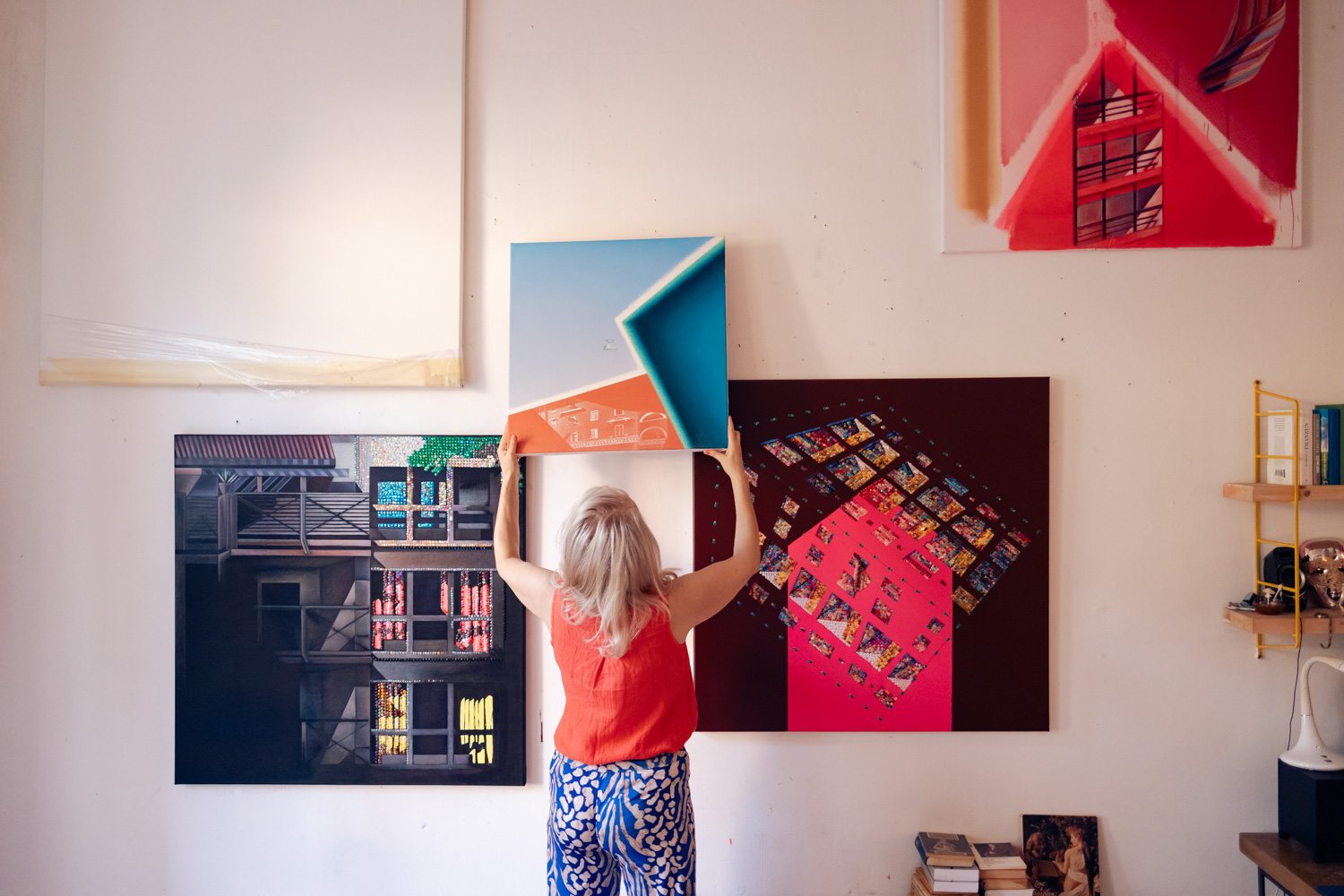 Neonos rózsaszín, lidérces lila, csillogó flitterek és panelházak geometriája – Gesztelyi Nagy Zsuzsanna képei egyszerre vonzóak és feszültséggel teliek. Festészete gyermekkori emlékekből és városi terekből táplálkozik, miközben álomszerű világokat nyit meg, ahol a személyes és az egyetemes, a rend és az érzelem találkozik.