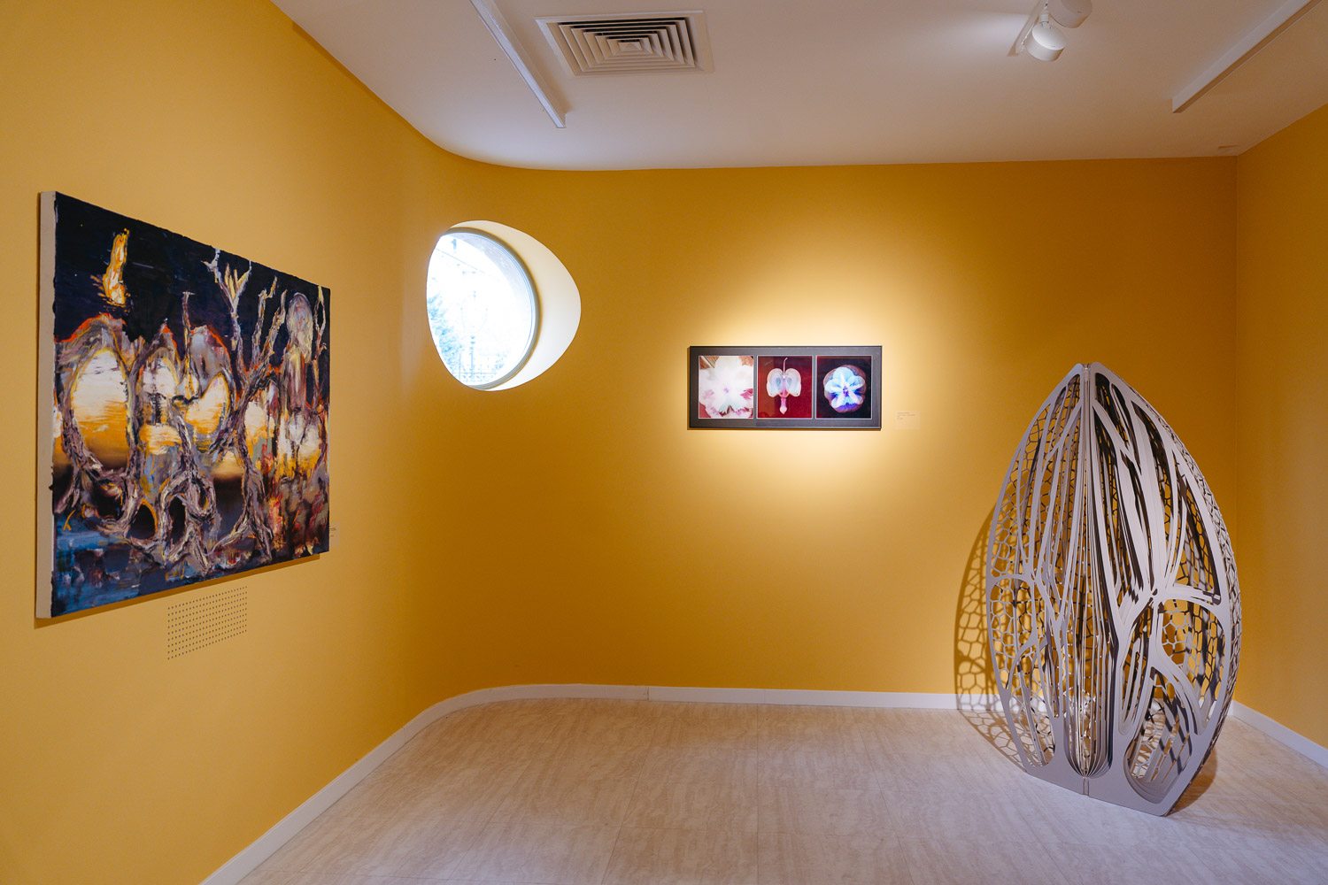Ez különösen azért hat meglepően, mert a grafikai tárlatokhoz általában egészen más élményt társítunk: kisebb, keretezett munkákat, egymás mellé rendezve, sokszor visszafogott fekete-fehér világban. Ehhez képest itt egy nyitottabb, levegősebb, helyenként kifejezetten grandiózus installációs gondolkodással találkozunk, ahol a grafika kilép a megszokott keretei közül.