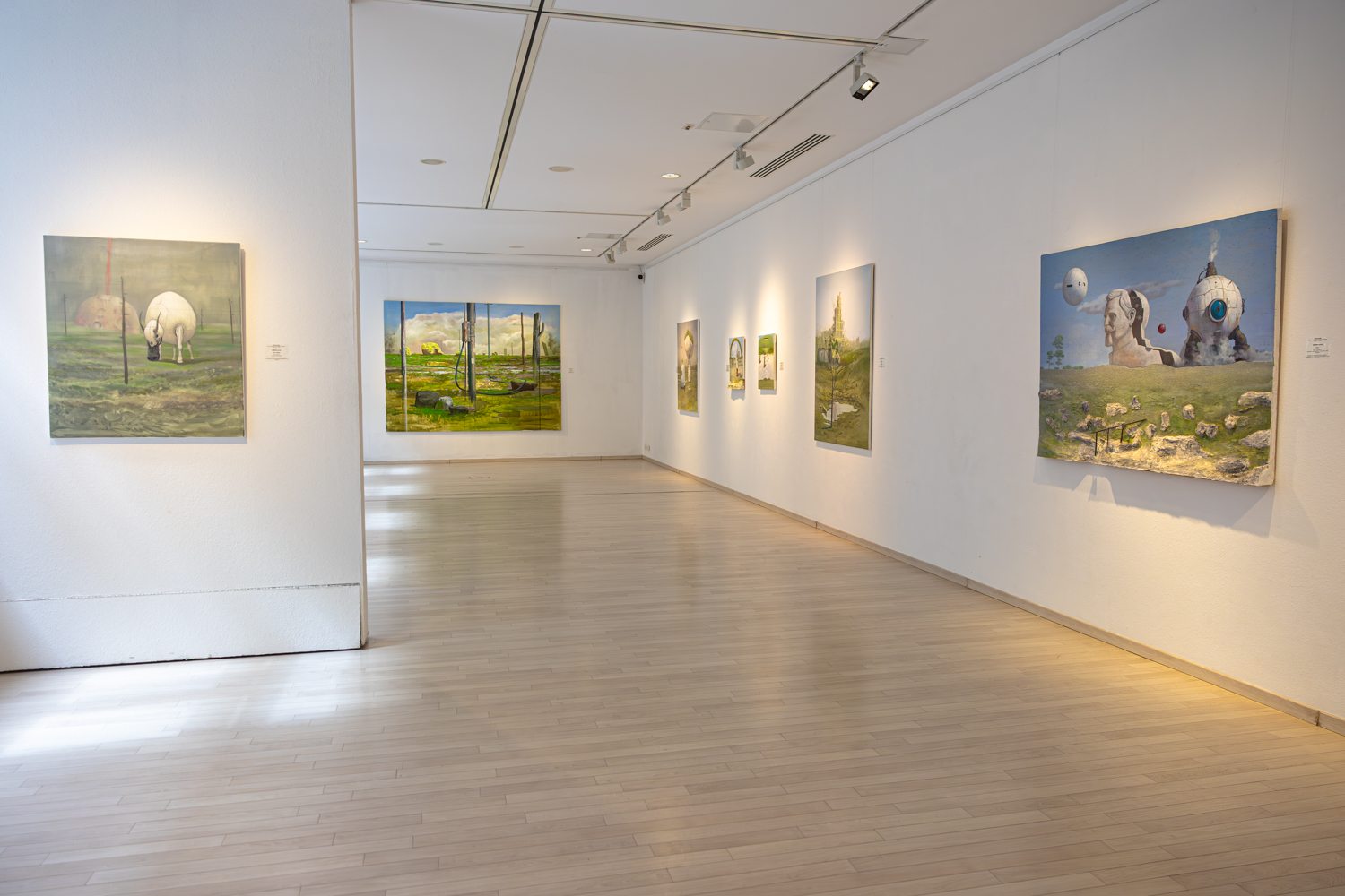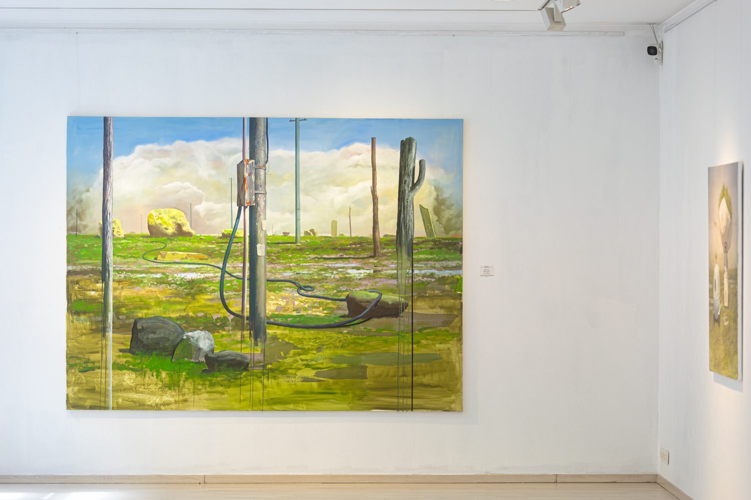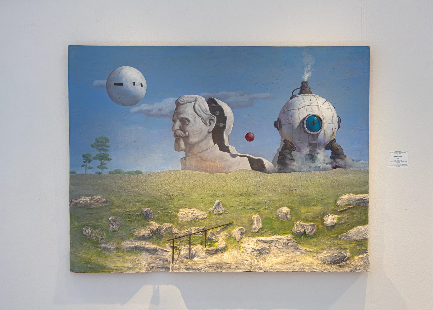 Herman képein a táj már nem a biztonságot nyújtó, barátságos környezet, ahol könnyedén el tudjuk helyezni magunkat, hanem egy kiürült világ, amelyből eltűnt minden kapaszkodó. A felbukkanó alakok sem kínálnak közelséget. Inkább idegenek, olykor kifejezetten űrlényszerűek, futurisztikusak és távolságtartók. Ezeken a festményeken a táj olyan ismeretlen térré válik, ahol a humán és a nem humán, az organikus és a mesterséges, az eleven és a maradványszerű már nem különül el tisztán egymástól. A hibriditás pedig nem felszabadító tapasztalat, hanem a szétesés és az idegenség jele.
