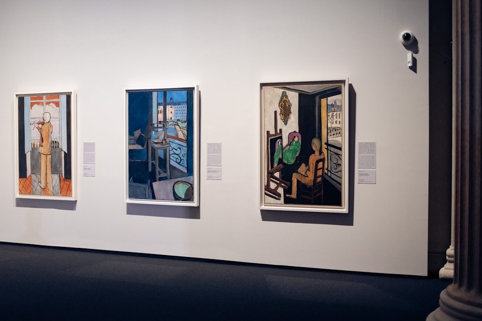 Ugyanakkor e festményeken fellelhető, hogy Matisse-t nemcsak a színek egymáshoz való viszonya izgatta, hanem az is, hogy a vászon síkfelületén hogyan tud térbelinek ható képet komponálni. Az itt látható három festmény a kint-bent minőségeit hozza játékba. A belső enteriőrökben alakokat látunk, egyszer-kétszer maga a festő is feltűnik. A bábuszerű figurák mozdulatlannak hatnak, síkszerű, geometriai alakzatnak tűnnek, térbeliségüket csak a környezet árnyalt megfogalmazása adja.