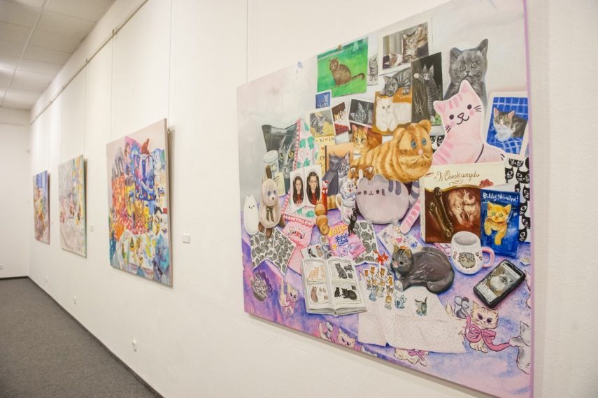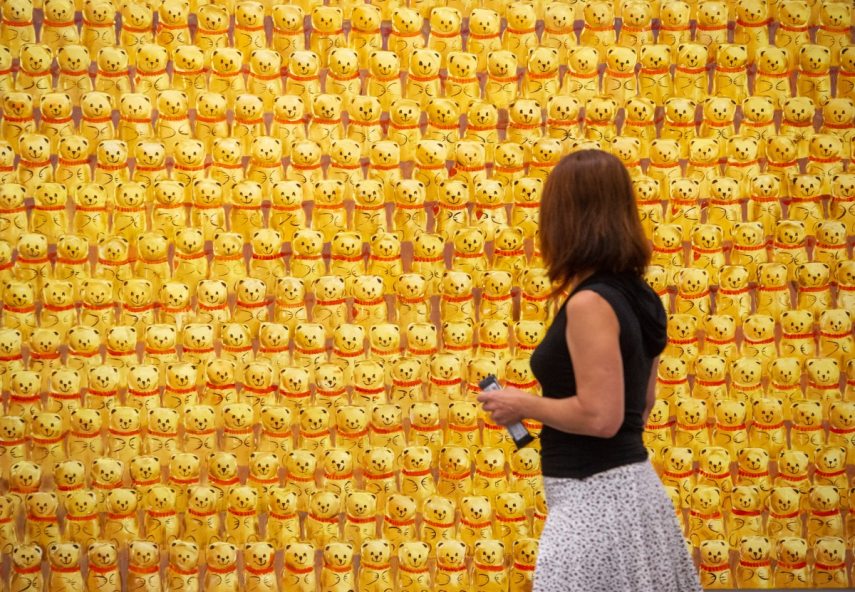 A komor hangulatú Mednyánszky-festmények után szemkápráztatóan színesek Tayler Patrick képei. A Még egy sor medve… időszaki kiállításon tárgyakkal és impulzusokkal túlzsúfolt életünk részletei tűnnek fel tarka „csendéletek” formájában: gumimacik, macskás csetreszek, műanyag vackok lepik el a kolorista festő nagyon is mai vásznait.