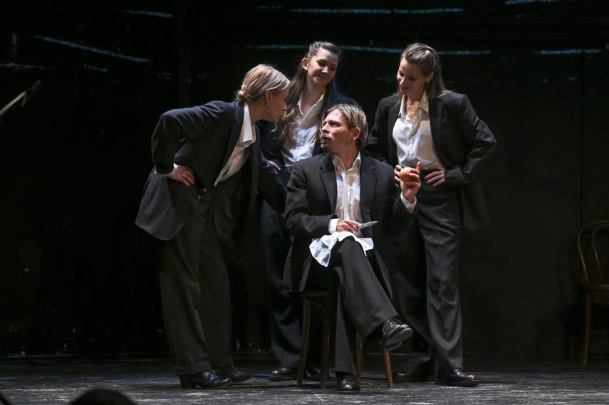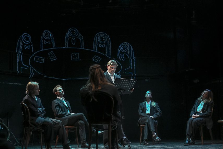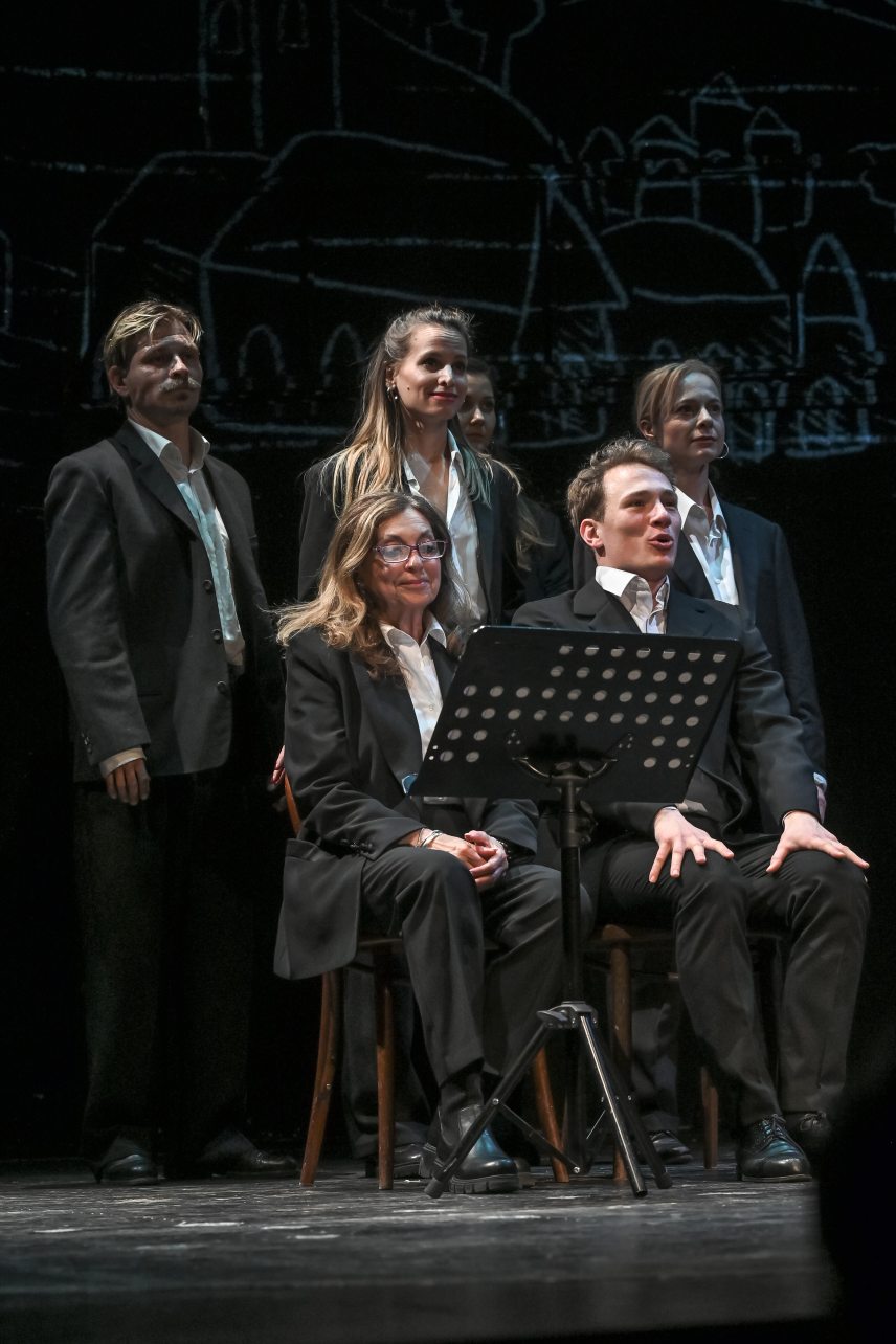 A muzsikusok és a játszó személyek a nyitott színpadon várakozva fogadják a közönséget. A zenészek zenélnek. Puritán színpadkép fogad: a takarások, járások, körfüggöny híján pőre színpad (látvány: Ilja Bocsarnikovsz). A színészek – férfiak-nők egyaránt – fekete öltönyben, a zenekar civilben. E beavatószínházi hangulat jellemzi az előadást.