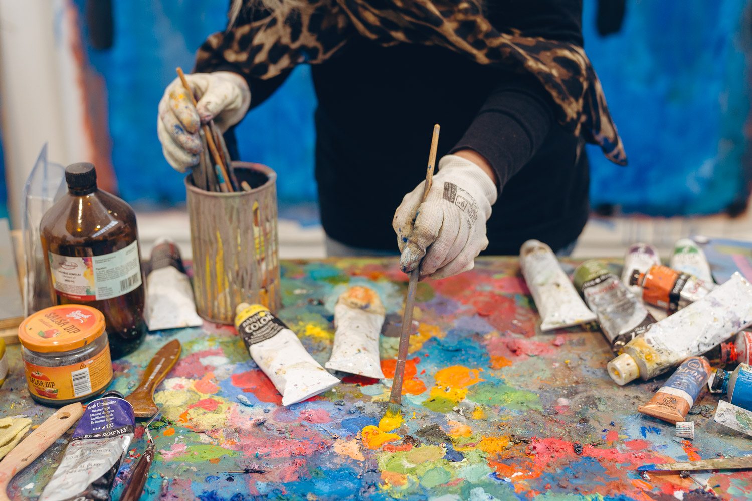 Közel megyek a képekhez, és egyből láthatóvá válik az a rengeteg ecsetnyom és érzéki gesztus, ami pulzálóvá teszi ezeket a kompozíciókat. Miközben én szórakoztatom a retinámat, Juhász meséli, hogy ez a festészeti nyelv nem egyik pillanatról a másikra született meg, hanem lassan, munka közben formálódott.